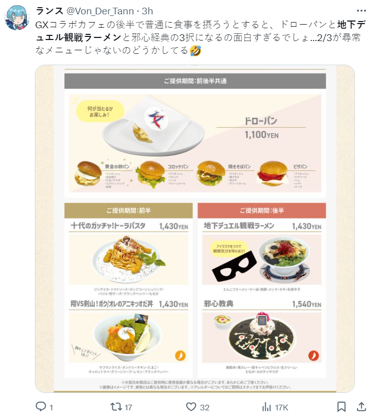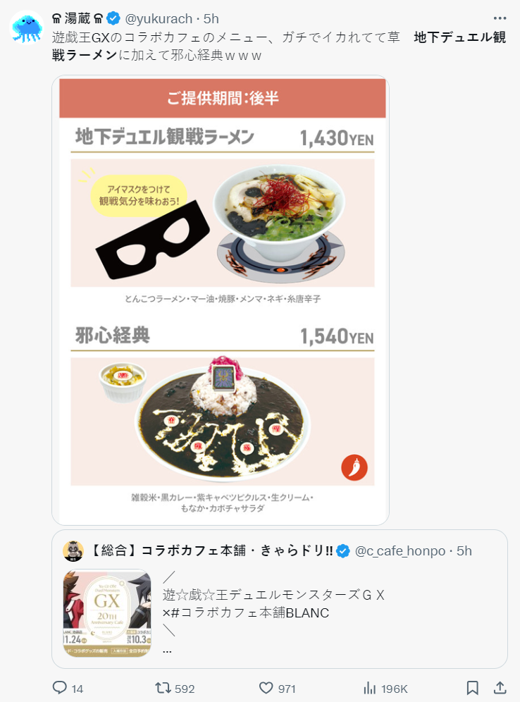 今年是《遊戲王GX》動畫播出 20 周年,與日本咖啡廳 BLANC 合作,開設 20 周年專屬的期間限定咖啡廳,公布了菜單與開幕時間,卻因為菜色過於特殊,登上了 X 趨勢,到底是什麼呢?
