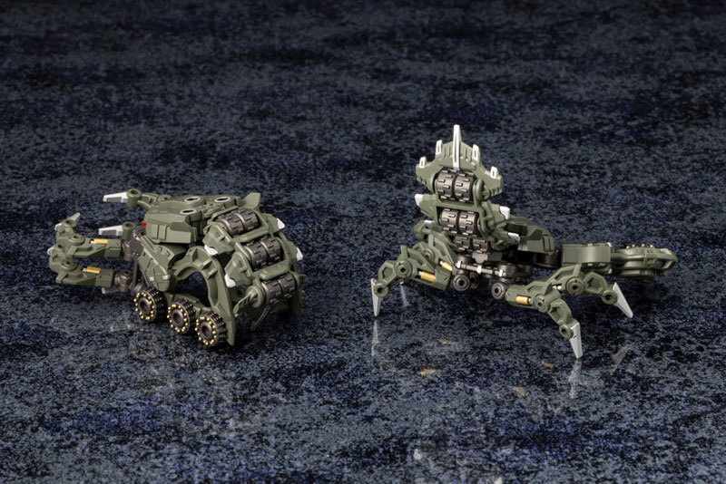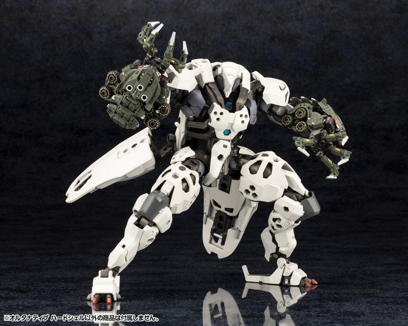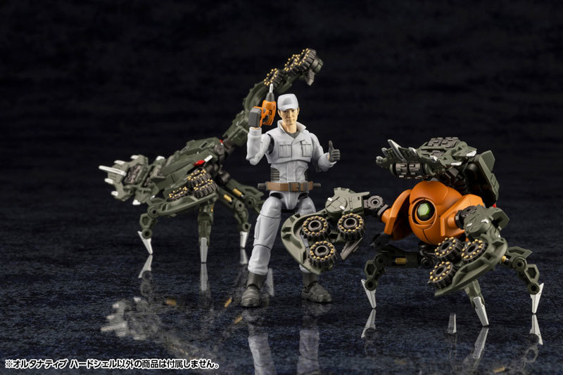 此次在尺寸較小、價格較低的分支系列『ALTERNATIVE』登場的新機「Hardshell」是軍事工業複合體 MSG 所開發的小型無人六角機牙,能藉由母機遠端操縱、以三種變形形態執行各種挖掘任務,包含碎岩用的「甲殼類形態」、搬運沙礫廢土的「輪車形態」,以及成為母機追加武器或裝甲的「鉤爪形態」。