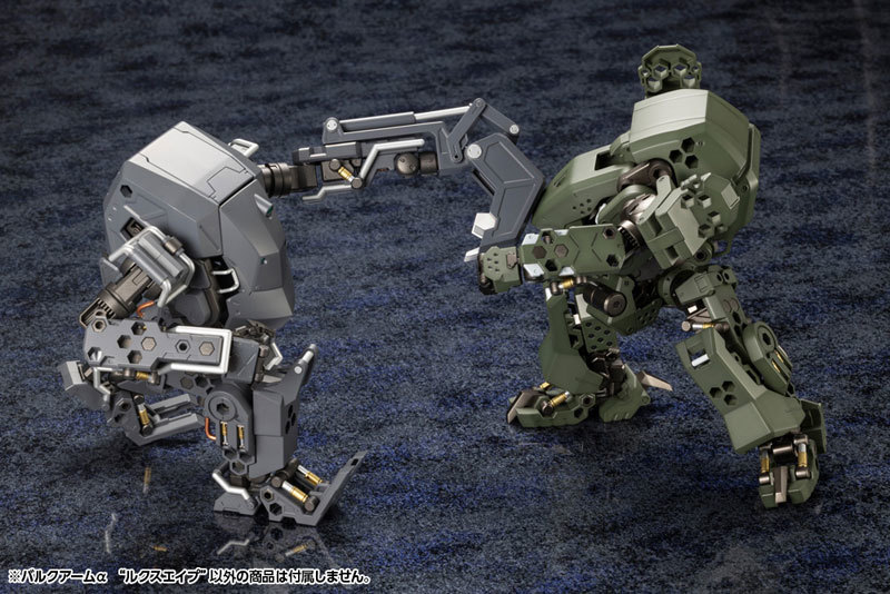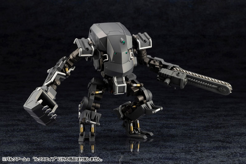「六角機牙 豪腕α Lux Ape」基於過去推出的豪腕α系列機骨架修改而來,運用新規零件、成型色再現全機輕合金製的框體、夜視能力特化的頭部組件、左腕的大型鏟斗組件,並附有機關槍、熱能刀、工兵鏟等多樣武裝。
