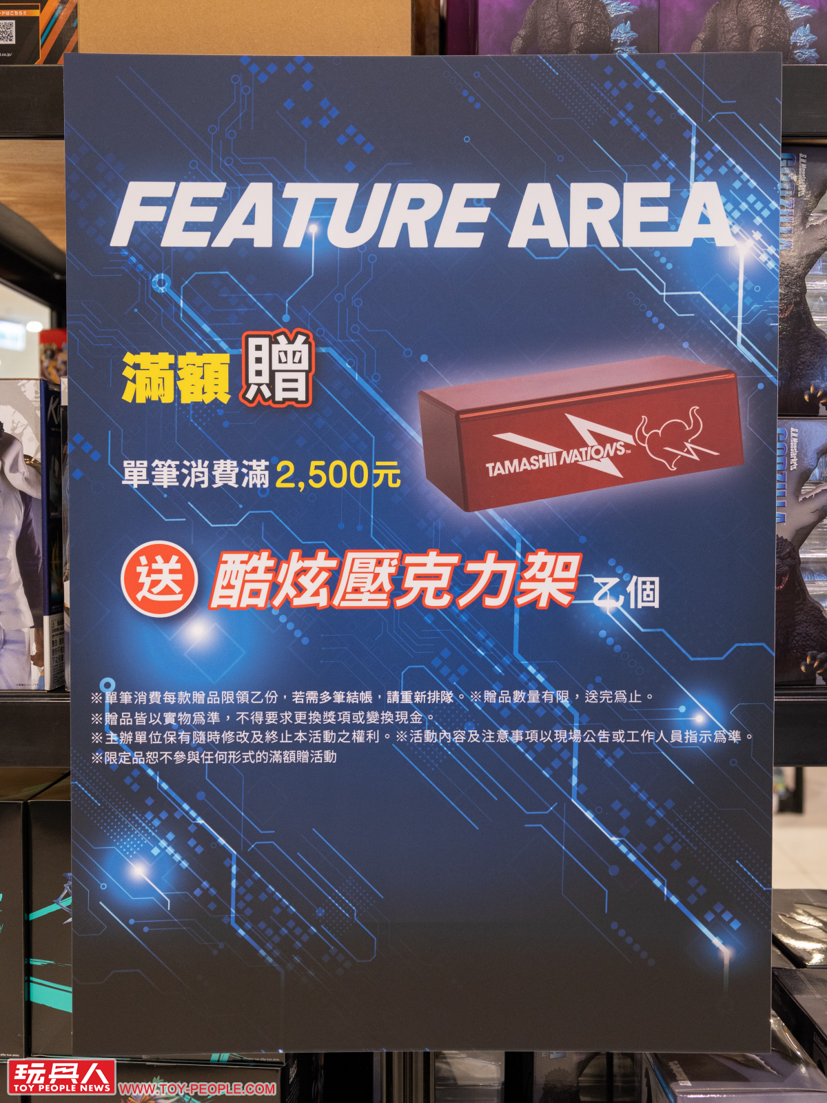 最後最後,就是要來跟各位玩具人報告一下好康的資訊!在 TAMASHII FEATURE AREA 位於新竹的會場,單筆消費滿 2,500 元(不含會場限定品)就會送酷炫壓克力架,只有新竹會場才有,數量有限送完為止喔!~