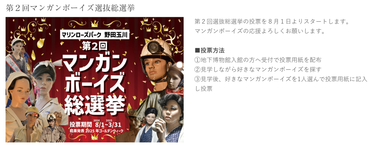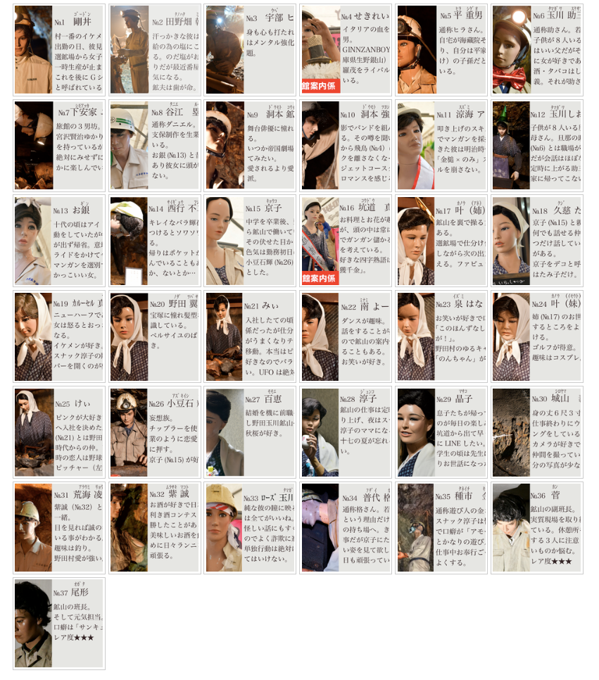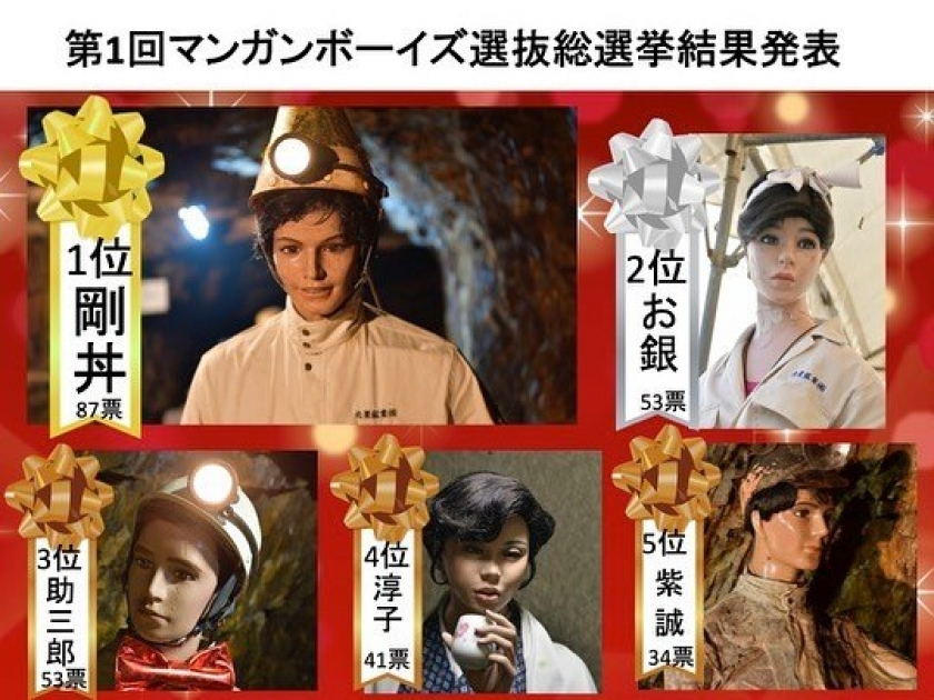 而所謂的地下偶像,就是這些在礦場被用來布置的人偶,官方稱其為「野田村MANGAN BOYZ」 ( マンガンボーイズ ),象徵在地下 420 公尺的野田玉川礦場的偶像團體,總計有 37 位人偶在其中,舉辦讓遊客票選最帥氣的一位。