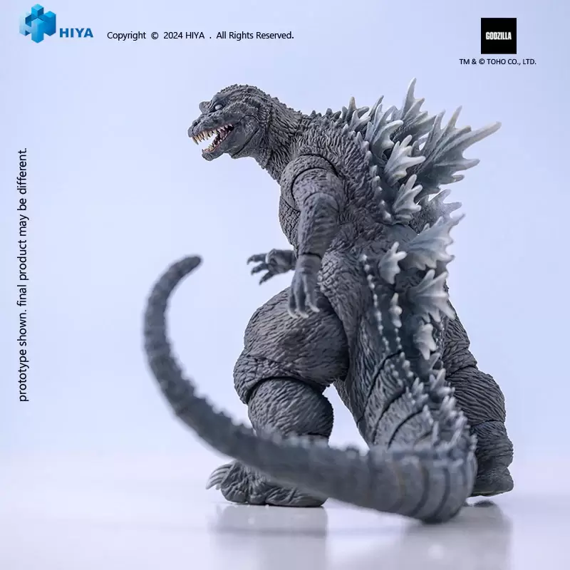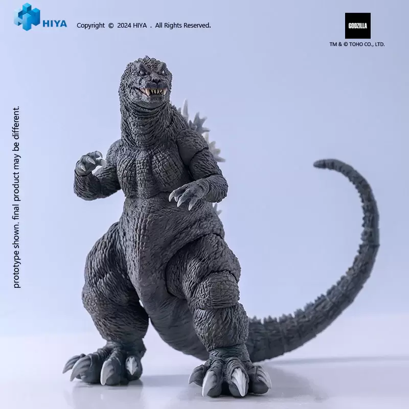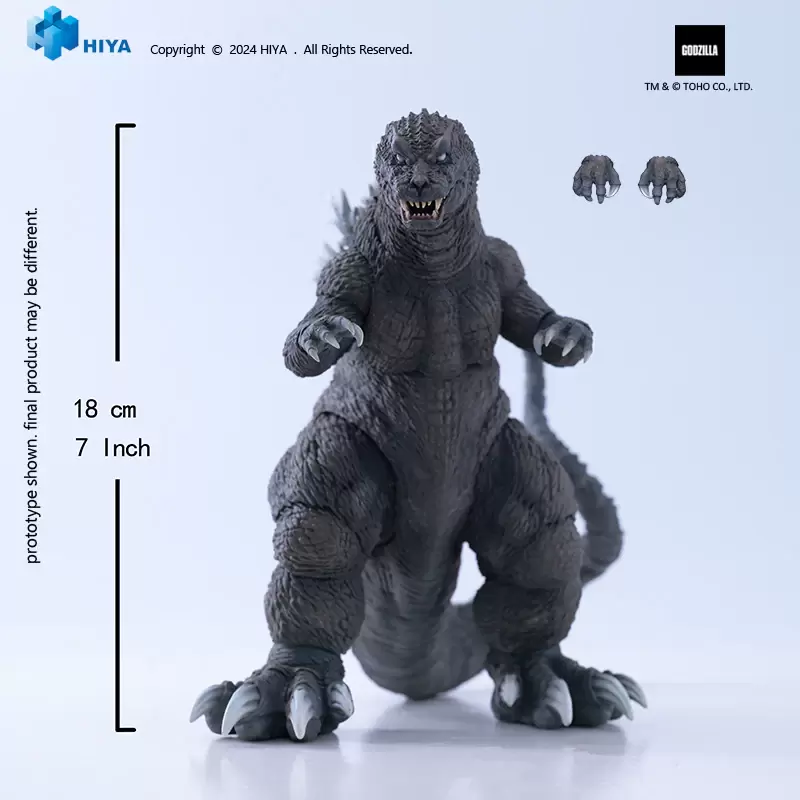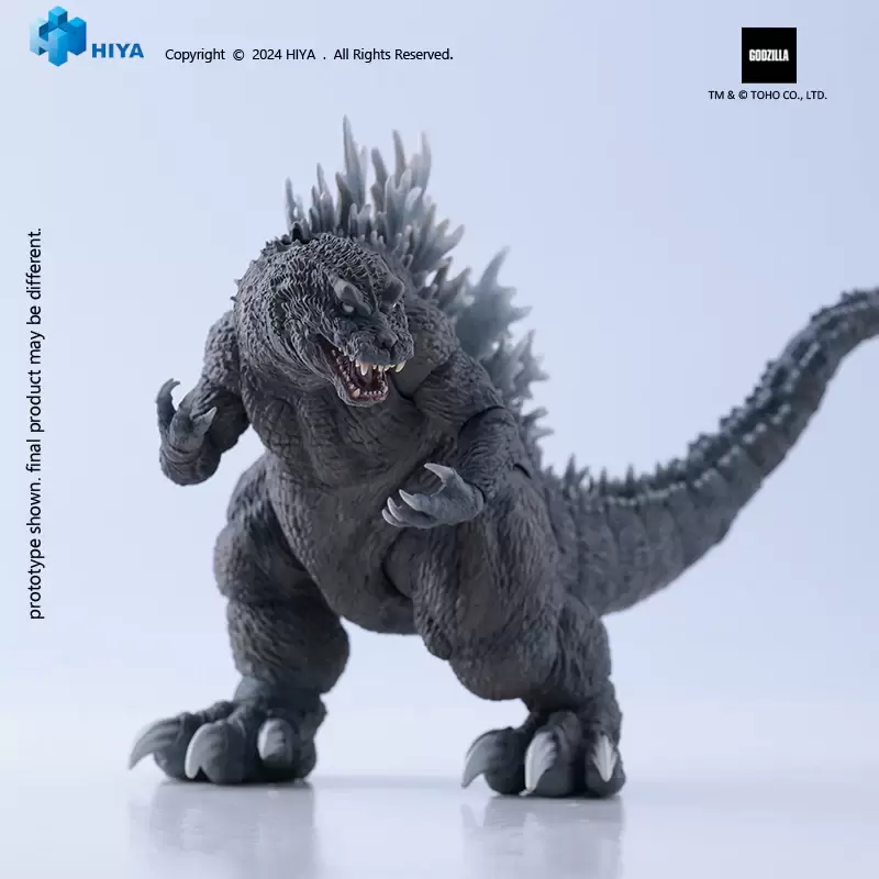HIYA TOYS「EXQUISITE BASIC 哥吉拉(2001)」無比例 7 吋可動模型,尺寸全高約 18 公分,參考當年電影的皮套戲服製作,致力追求皮套棘狀的皮膚細節與質感,還原經典的白色眼珠與兇惡的頭部、粗壯的雙腿、巨大的腳爪等造型;透過多層塗裝再現充滿威嚇性的利牙、背脊施以灰藍到白的漸層效果,將破壞神哥吉拉令人畏懼的姿態完全重現!