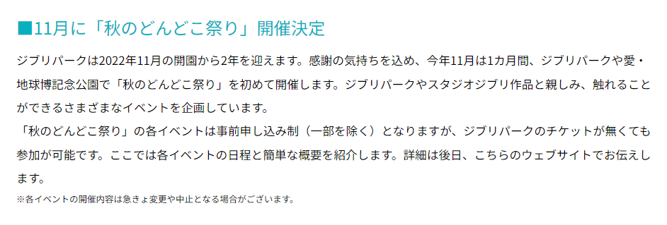 近期官方也宣布了,為了迎接首次園區全面開放的周年,在今年兩周年之際舉辦「秋季DonDoKo祭典」( 秋のどんどこ祭り ) 活動,這也是官方首次舉辦主題活動,屆時整個愛·地球博記念公園園內都有相關活動,就算未購票也可以體驗歡樂氣氛。