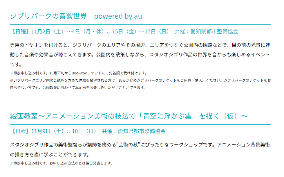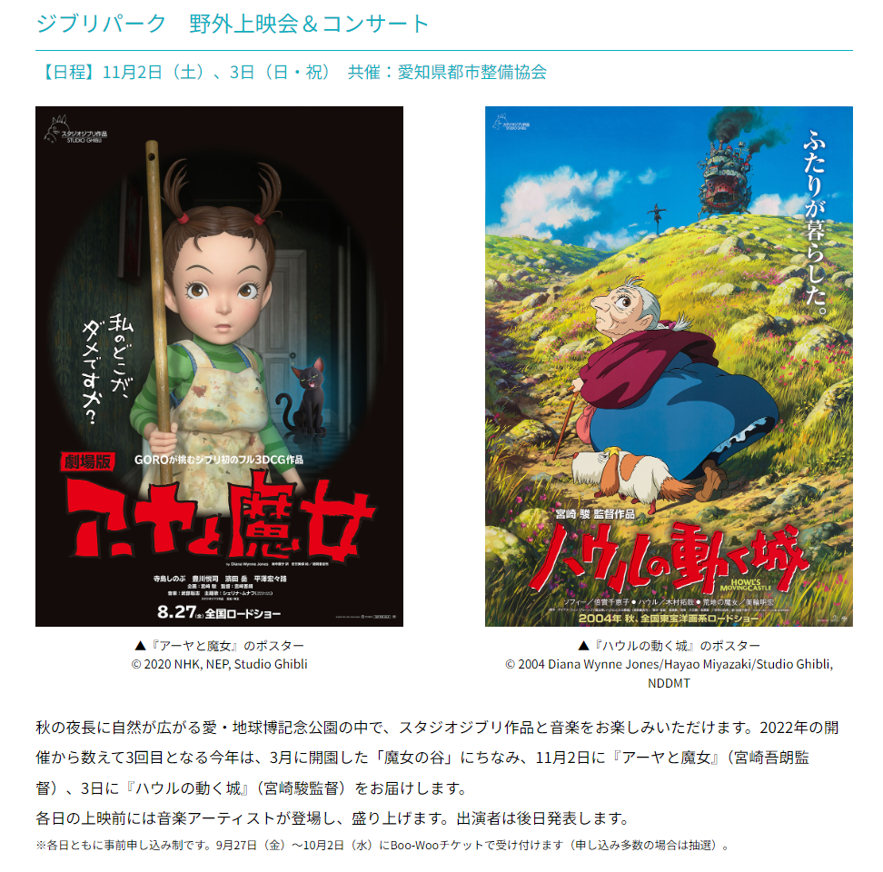 目前也預告在 11 月 2 日 & 3 日將會有野外電影日的舉辦,包含 : 《安雅與魔女》&《霍爾的移動城堡》,電影開播前還會有音樂藝術家前來,跟大家一起同樂沉浸在吉卜力的音樂世界,該活動必須線上抽選申請。