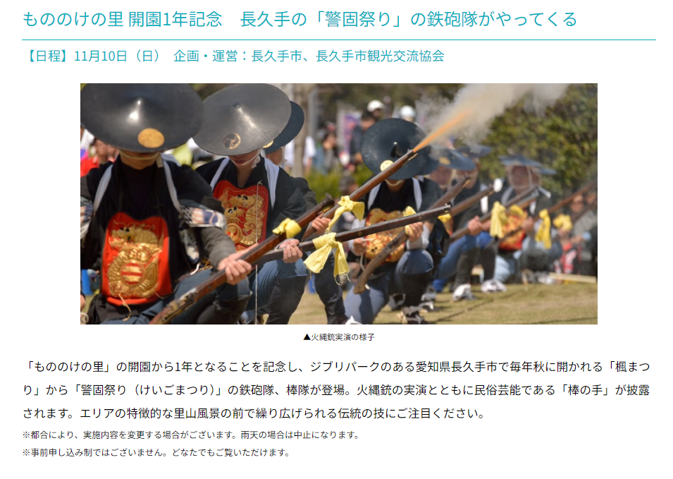 另外先前一周年曾在園區舉辦,由愛知縣長久手市的傳統活動「警固祭」將會到園區演出。祭典會牽著馬匹,馬背上會有著華麗裝飾的馬鞍,在槍隊和棒隊的護衛下,在區內巡遊,不時火繩槍還會發射炒熱氣氛。原本是該地村落豐年祭舉辦的習俗,也被列為民俗文化遺產。