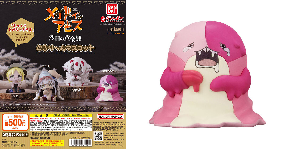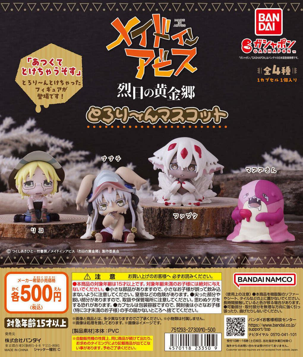 由日本萬代玩具公司轉蛋事業部 GASHAPON 發行、將角色打造成彷彿冰淇淋一般柔軟的「融~化模型 (暫譯,とろり~んマスコット) 」將在 2024 年 9 月第三週發售出自電視動畫《來自深淵》的最新商品「來自深淵 烈日的黃金鄉 融~化模型」!一共有 4 種款式可以收集,建議售價為每轉 500 日幣。