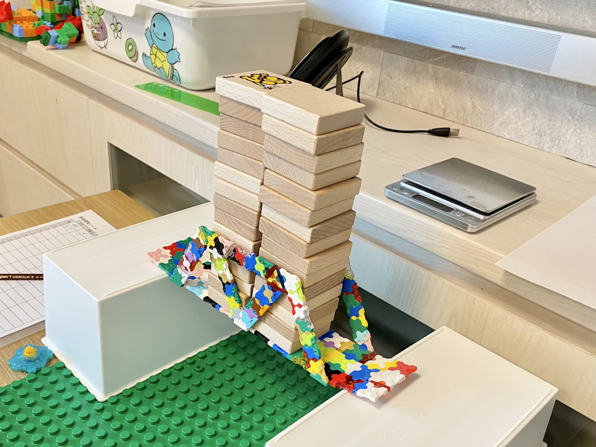 息子氏が、小学生になり初めての自由研究は「つよいはしをつくる」というテーマで、1kgに耐える軽い橋を目指し、毎朝学童に行く前にLaQで橋を作っていた。初手で意外と強いトラス橋を作りつつ、最終的に半分以下の軽さで普通には見ない橋を作っていたのが良い。 pic.twitter.com/kTahOZm9ML