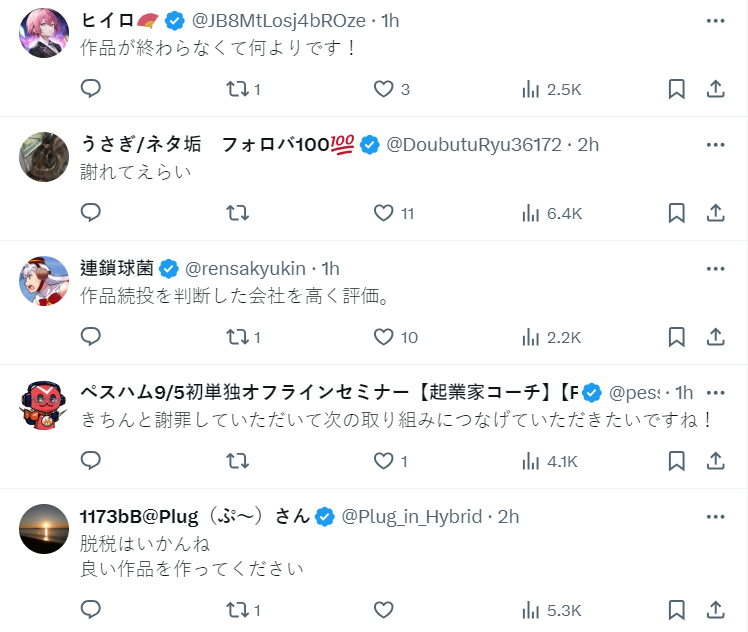 不少粉絲也對他的道歉感受到誠意,認為雖然惹上稅務法律風波,但坦承過錯並接受判決並不影響他在《藥師少女的獨語》漫畫的創作,也感謝出版社 ( Square Enix ) 願意讓她繼續畫這部作品。