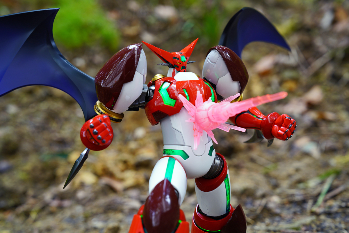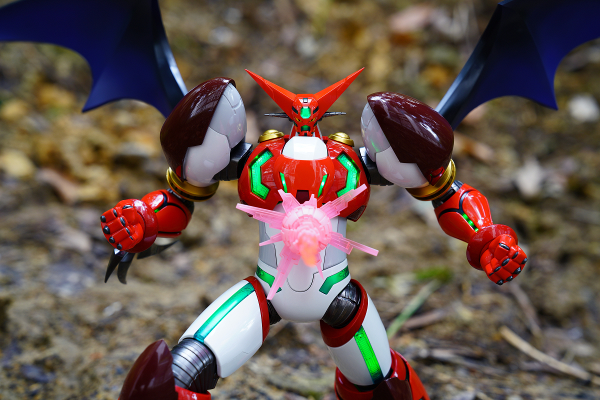 個人覺得最讚的地方是其燈效!全身上下都有發光位置,而大部分採用磁控開關,故玩上手時非常貼心。連 Stoner Sunshine 及 Getter Beam 都有光效!不過下胸部有漏光情況,另因為設計問題,拳頭/前臂發光位置為旋轉式卡榫,所以扭動拳頭時有機會導致整組拳頭連燈組掉下;希望這一點在大貨推出時有所改善。最後是個人觀感問題。既然以原汁原味作主打,雖然灰色分隔在視覺上的而且確是更搶眼,但真三一萬能俠沒有部分是灰色的...... 這個廠方在出貨時可以考慮轉回白色。