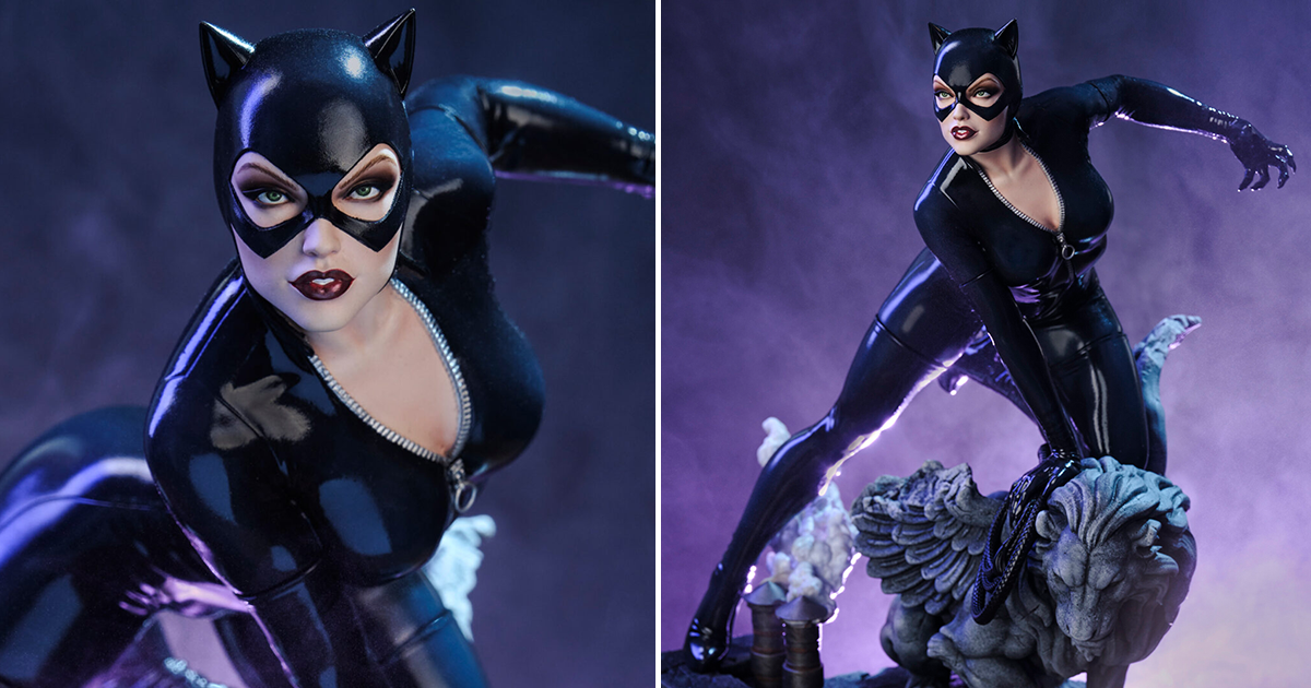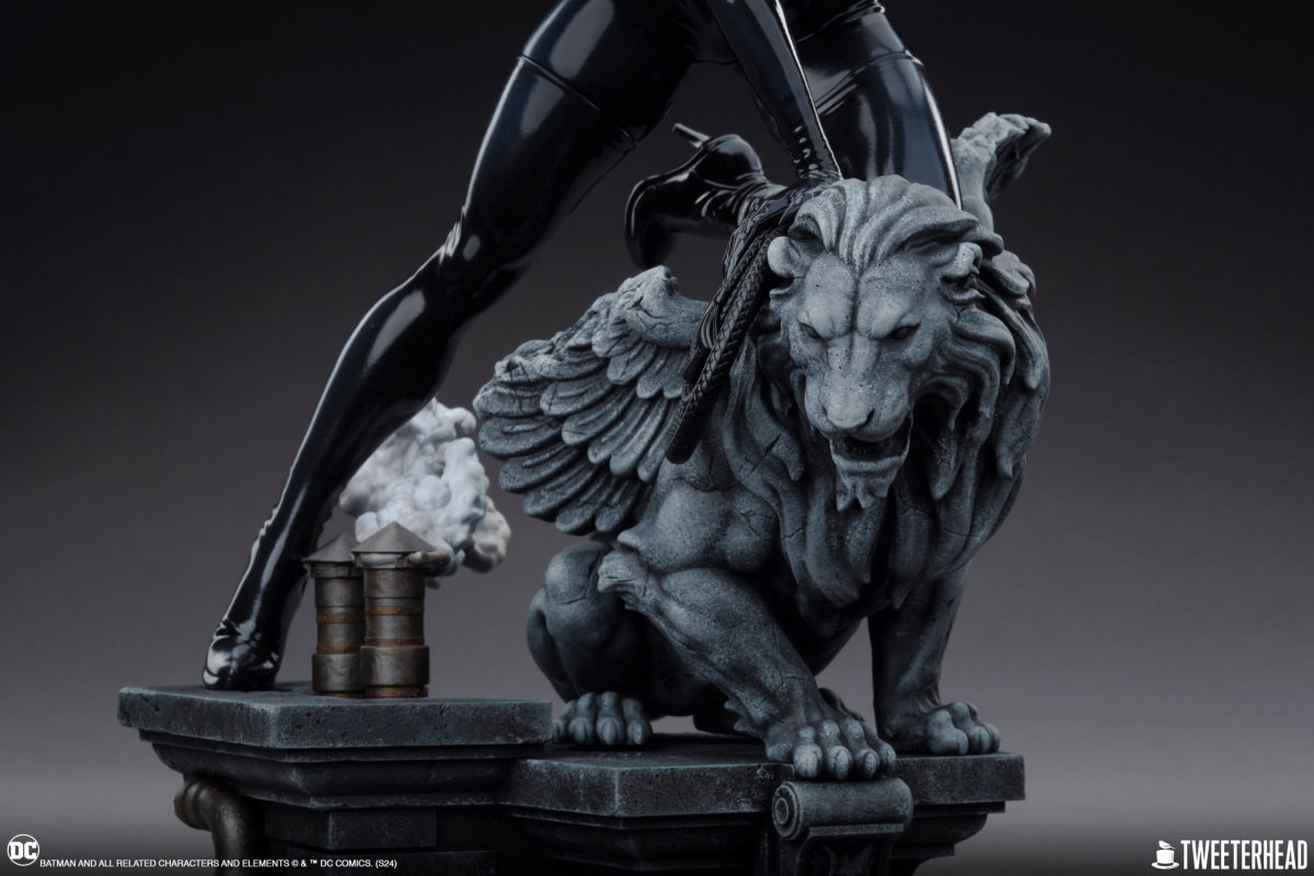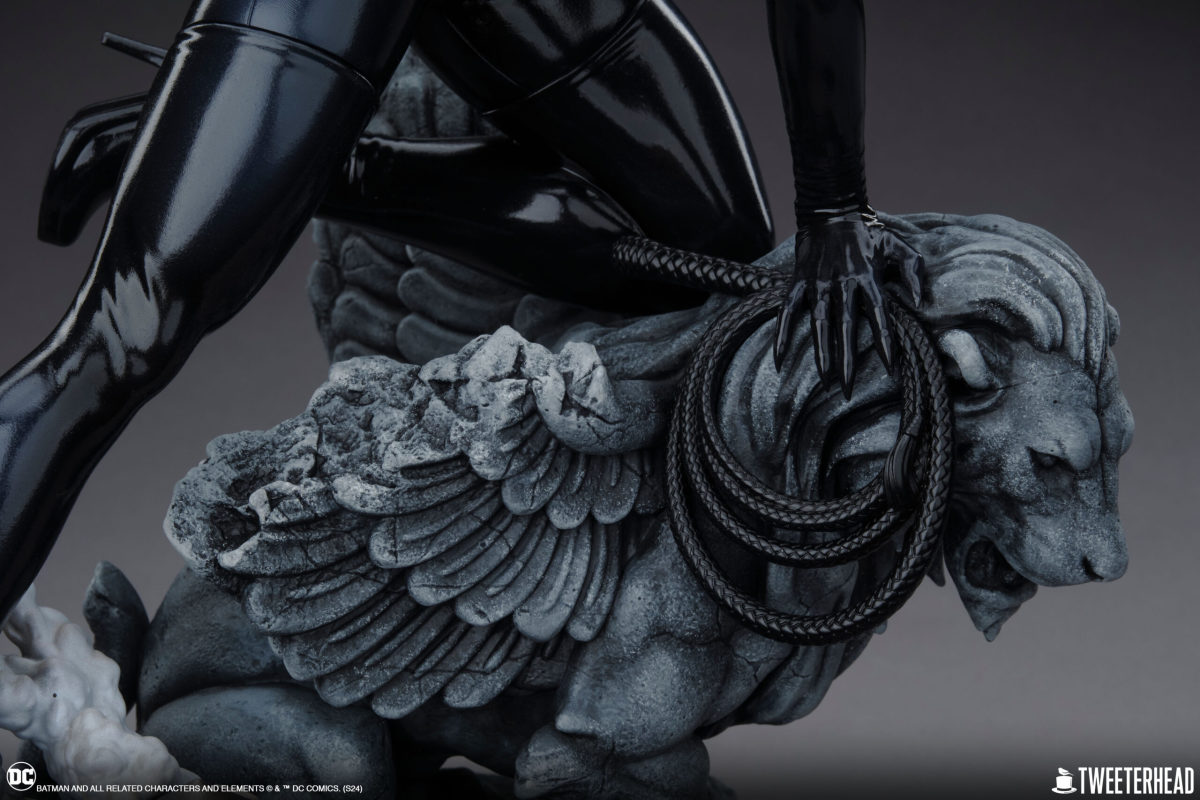 這次兩種比例的貓女雕像高度分別是 35.2、46.6 公分,展現出瑟琳娜立於高譚市的建築屋頂、將左腳膝蓋恰好放在石造獅子雕像上的姿態,並傳達出靈敏、輕巧的角色特性,一身漆黑、散發亮面光澤的皮革感緊身衣絕對是整體的視覺亮點,加上拉開至胸部拉鍊、凹凸有致的身形曲線、臀部緊緻且圓潤的線條,以及逆天長腿,真的超級辣!直視前方的銳利眼神、伸出利爪的左手,右手還按著皮鞭,被她盯上的獵物肯定逃不掉!