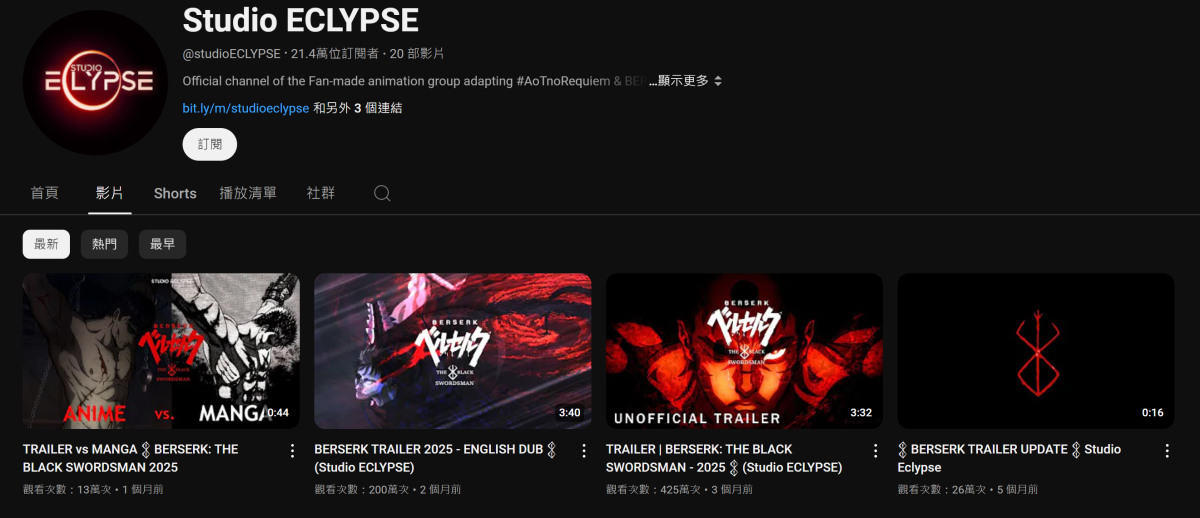 實際前往「Studio ECLYPSE」的 YouTube 頻道,的確有不少製作的《烙印勇士》動畫,甚至使用漫畫畫面重新製作成自製的動畫。
