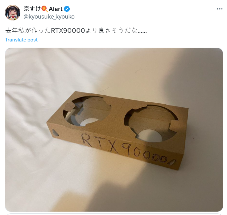 近日在日本 X 上,有位推主貼出自己自製的「紙箱 RTX4090」,自嘲是個沒錢買不起原版的自我安慰手法,卻引來不少網友關注,甚至有人表示有同樣的經驗,自製土砲顯卡並不孤獨。