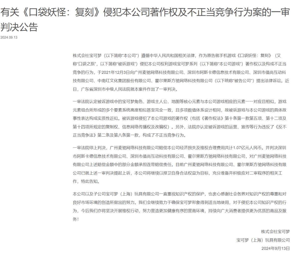 雖說一審判決賠償 1.07 億元人民幣,但被告仍提起上訴,寶可夢官方也表示持續捍衛合法權益,充分準備並積極應對二審的判決。