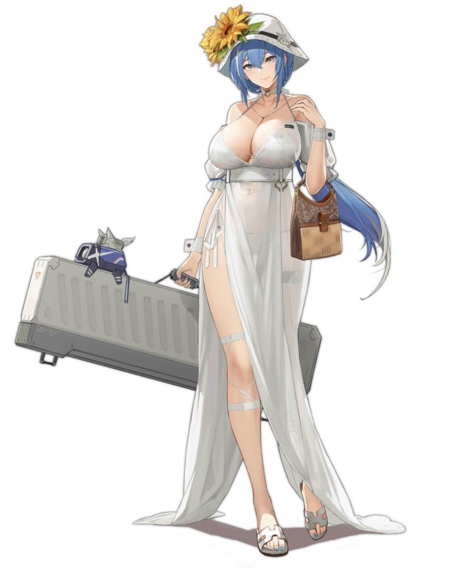 若隱若現地透出內部的比基尼泳裝和豐滿肉感。可以拆卸的設計,更能夠直接地欣賞清爽又大膽的泳裝造型!除此之外,頭戴的向日葵遮陽帽也可以拆下,能夠自由搭配不同的裝扮造型。