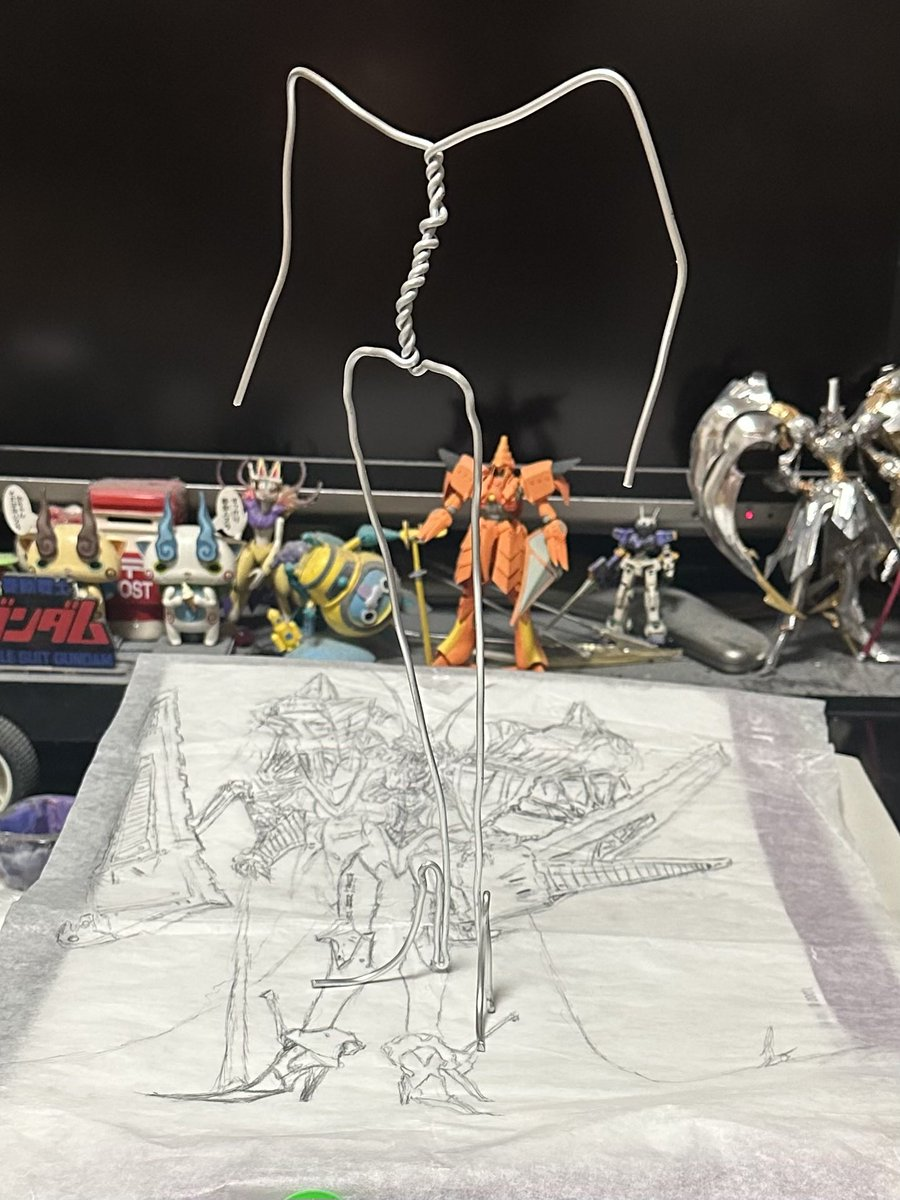 由於《五星物語》的機體大多都是細長且細節零件眾多,他的製作方式通常會先以鐵絲勾勒出機身線條,再透過自行手繪的方式先揣摩機體細節,一個個黏土開始上手捏塑成形,當然要拿捏好比例跟還原度,也才從拙劣成為越來越精湛的手藝。