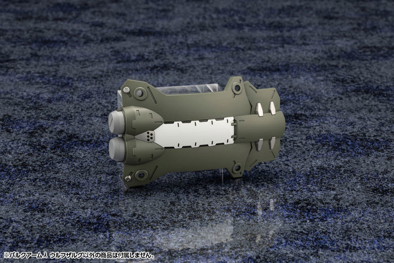 「六角機牙 豪腕λ 狼戰士」採用深綠、淺灰、灰、槍鐵、銀、透明紅、透明橘等七色成型零件構成,全機基於原本豪腕λ系列骨架修改而來,運用大量新規零件再現全身帥氣裝甲造型、超大型武裝,表現高密度細節的厚重質感,同時兼具靈活的可動關節設計。