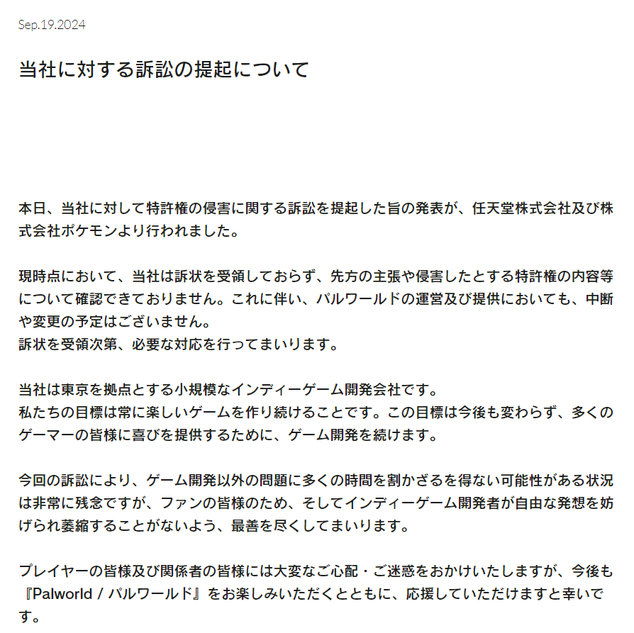 在同日傍晚,《幻獸帕魯》開發商 Pocket Pair 也正式發文表達自己的立場,針對任天堂向自家提起訴訟之事,跟玩家與大眾說明目前情況。