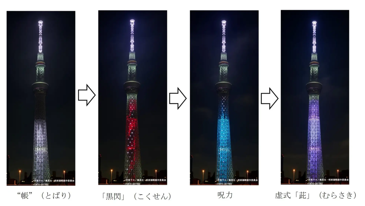 展覽期間,東京晴空塔也會依照四種主題切換外部燈光顏色,包含 : 「帳」、「黑閃」、「咒力」以及「虛式 茈」的樣式。