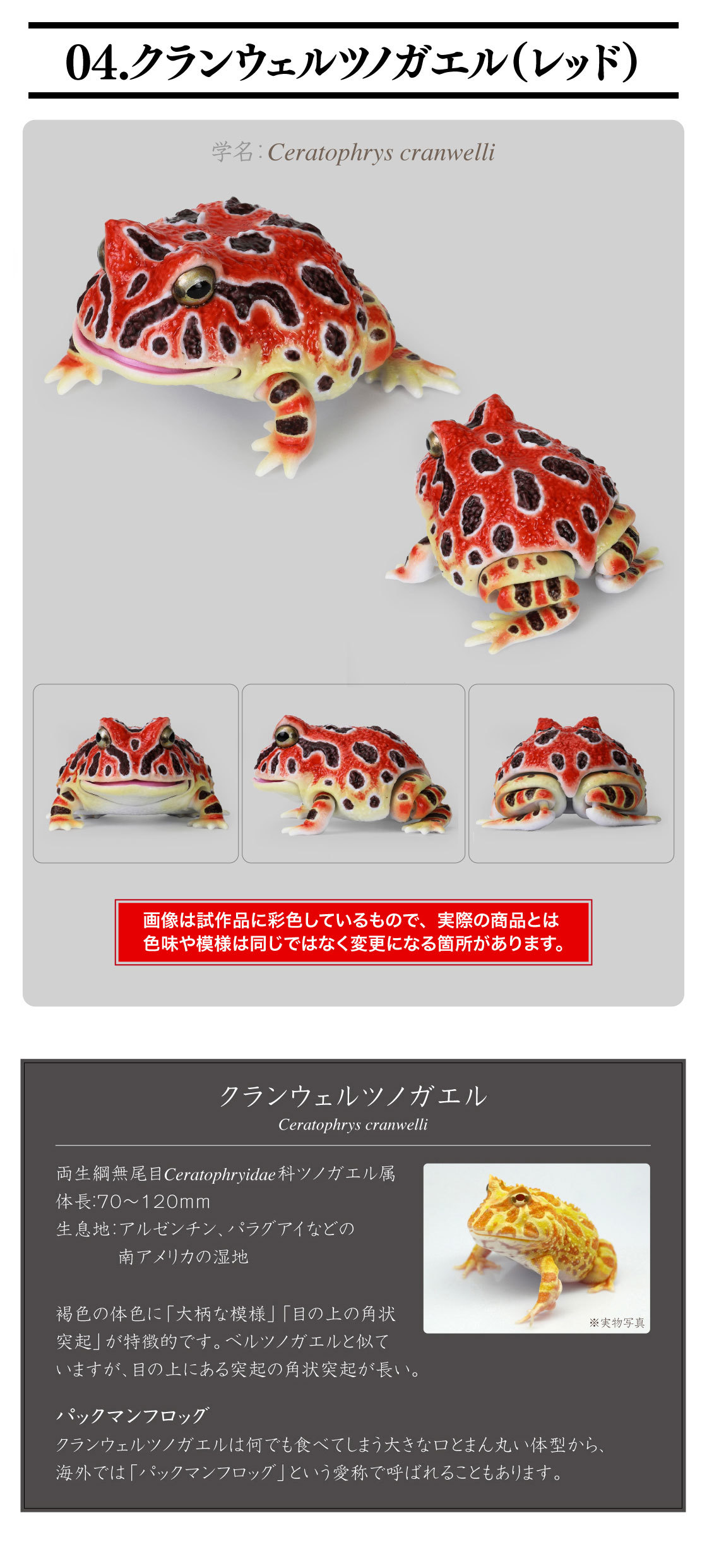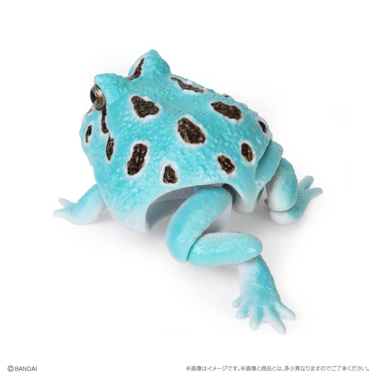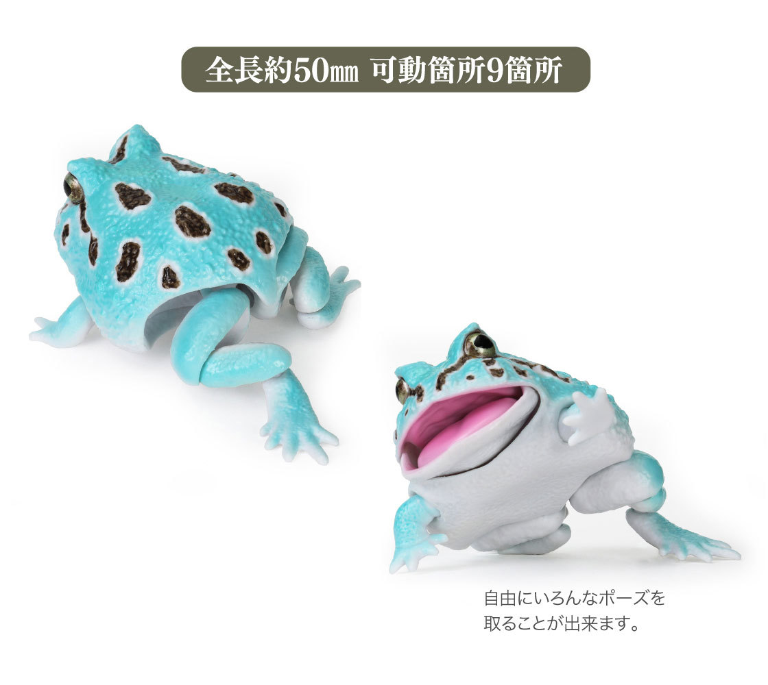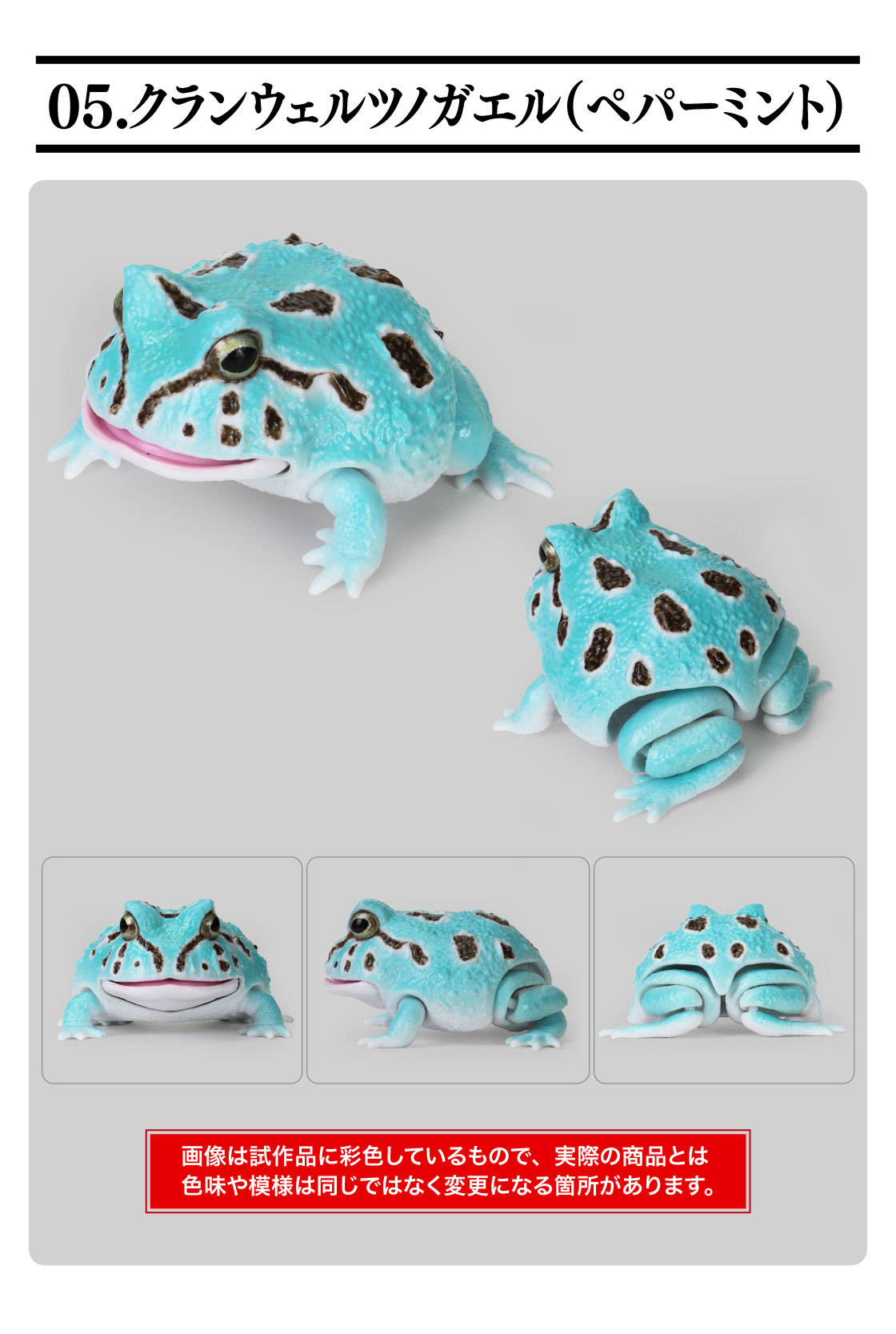 「生物大圖鑑Repti 圓眼珍珠蛙&角蛙」轉蛋,以外貌相當可愛趣味的小丑蛙-圓眼珍珠蛙以及人氣萌寵角蛙為主角,採用嘴、手腳等全身 9 處可動關節的較簡易版本製作,尺寸約全長 60 mm,仔細還原蛙蛙們皮膚特徵的疣粒與大眼大口,收錄有青綠、深綠與黃色三種顏色的小丑蛙,另外紅色、薄荷色的新配色角蛙也新登場!特徵的皮膚以及呆呆萌萌的眼神,放在手心上簡直太可愛!