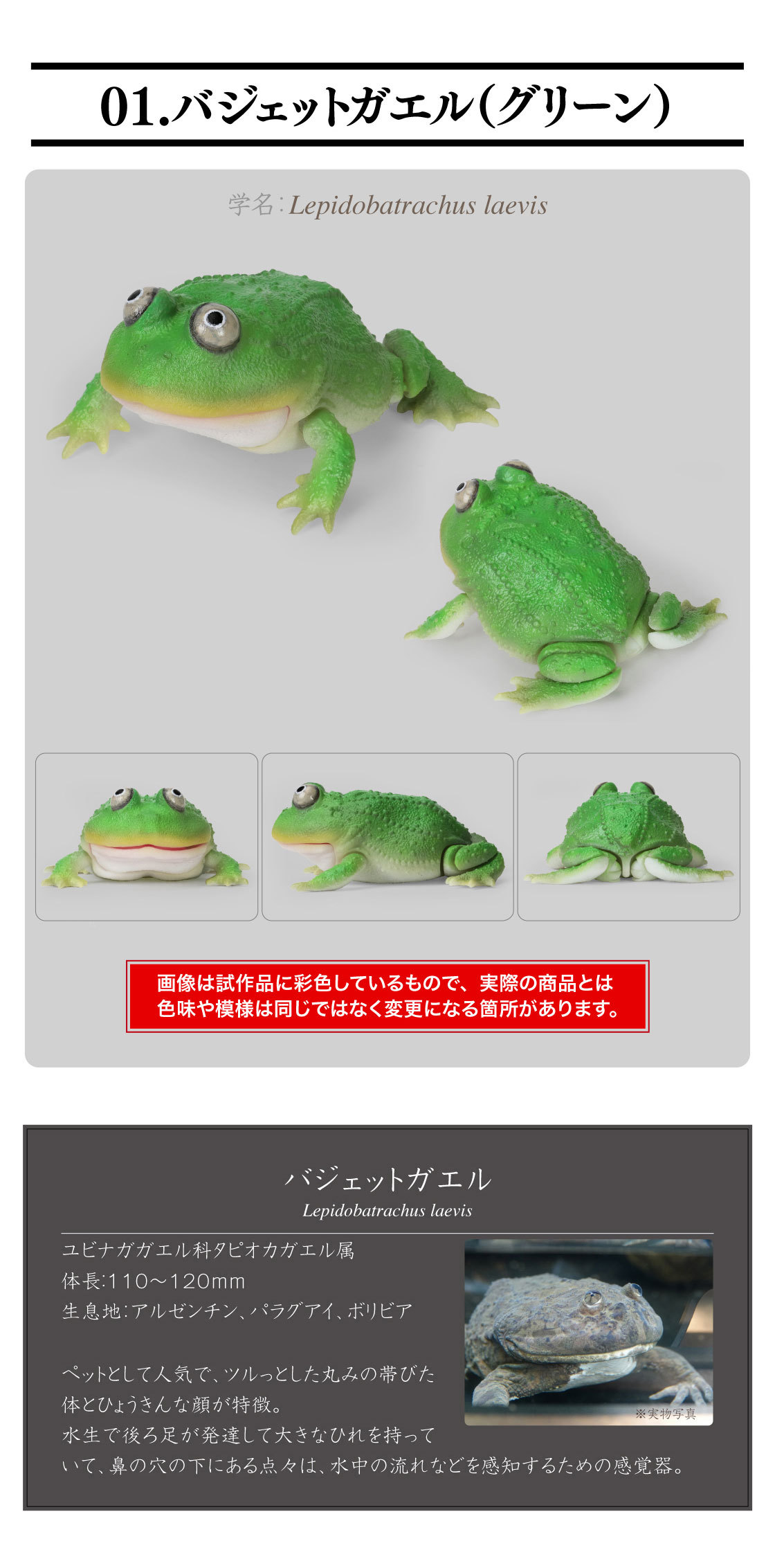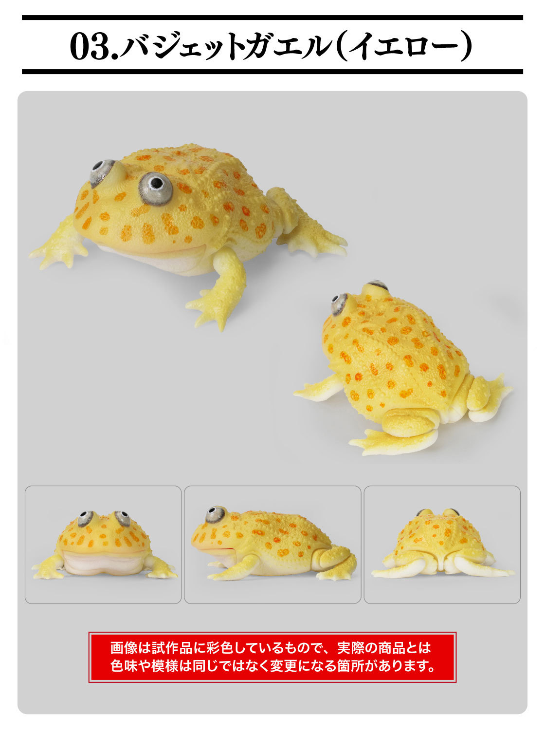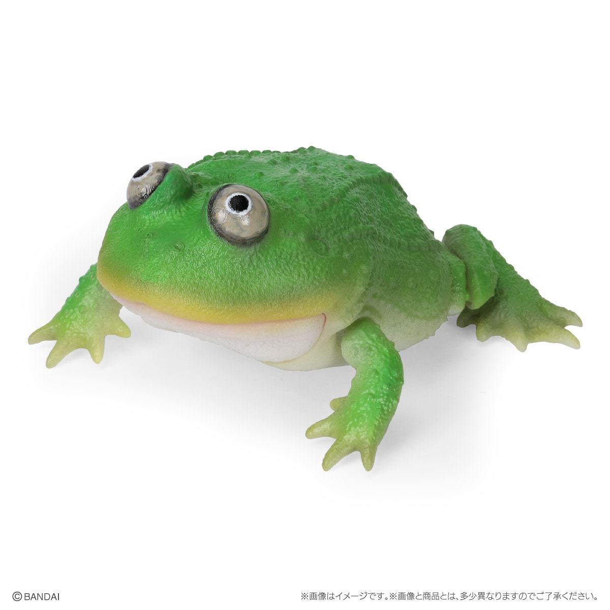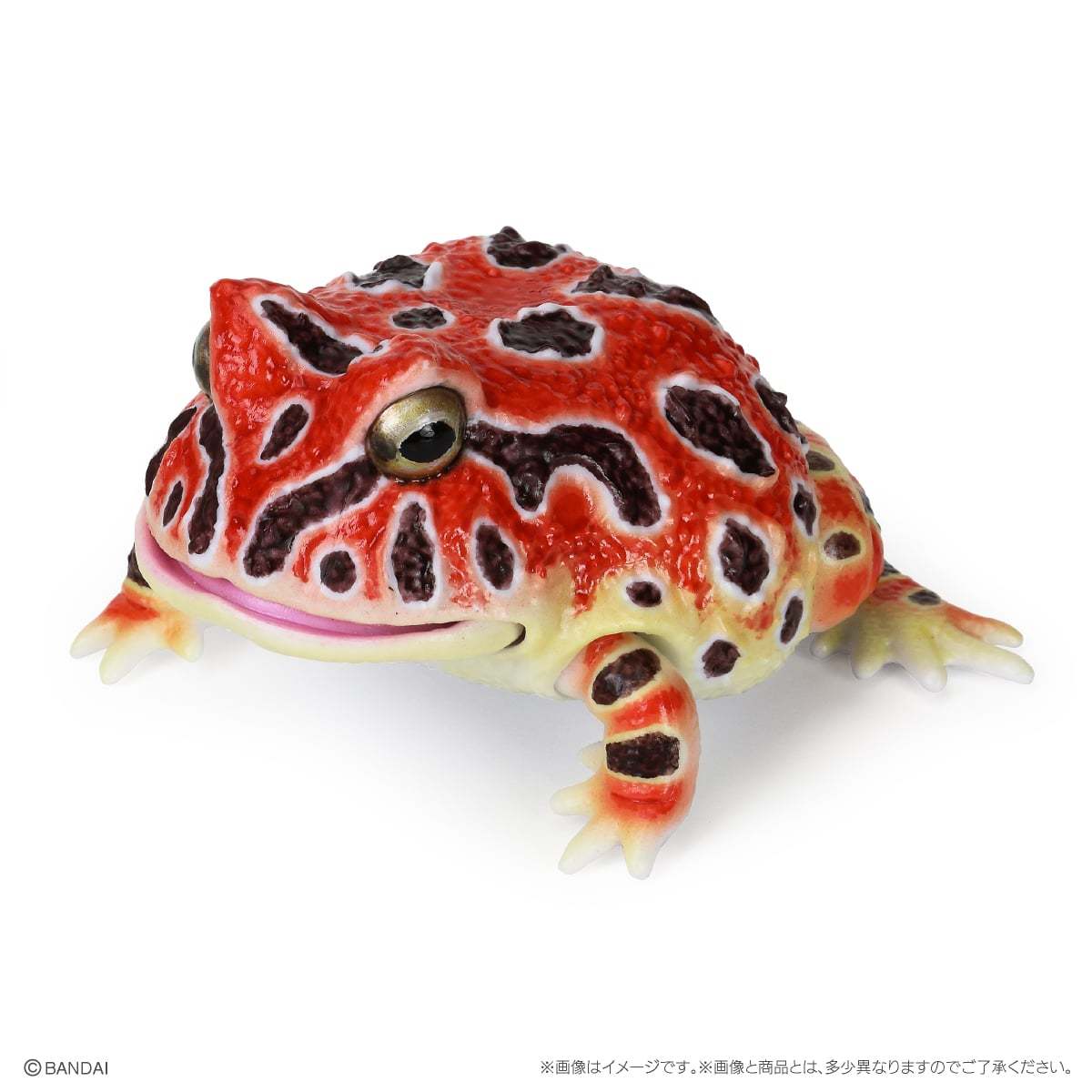 「生物大圖鑑Repti 圓眼珍珠蛙&角蛙」轉蛋,以外貌相當可愛趣味的小丑蛙-圓眼珍珠蛙以及人氣萌寵角蛙為主角,採用嘴、手腳等全身 9 處可動關節的較簡易版本製作,尺寸約全長 60 mm,仔細還原蛙蛙們皮膚特徵的疣粒與大眼大口,收錄有青綠、深綠與黃色三種顏色的小丑蛙,另外紅色、薄荷色的新配色角蛙也新登場!特徵的皮膚以及呆呆萌萌的眼神,放在手心上簡直太可愛!