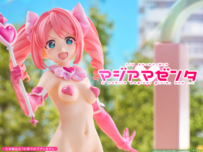 「瑪吉雅洋紅」1/7 比例模型,以劇中衝擊的造型登場!!徹底還原洋紅為了對抗瑪吉雅邪惡的剪刀攻擊,在重要部位貼上粉色愛心貼紙的英勇裝扮:「這次不會輸了,這樣妳就拿我沒辦法了吧!」。尺寸全高約 24 公分,精美地刻畫出洋紅美麗的身體線條,玲瓏有緻的胸部搭配色氣十足的貼紙,整體十分大膽,搭配可愛活潑的粉色以及洋紅信心滿滿的表情,營造出迷人的反差感。