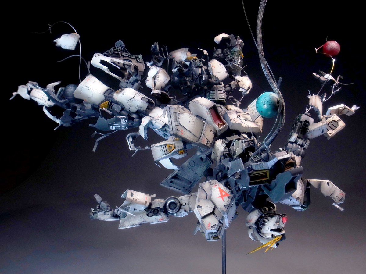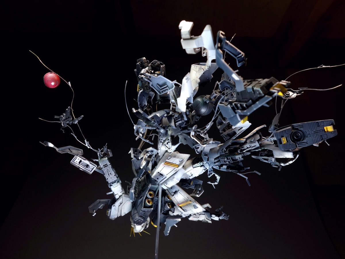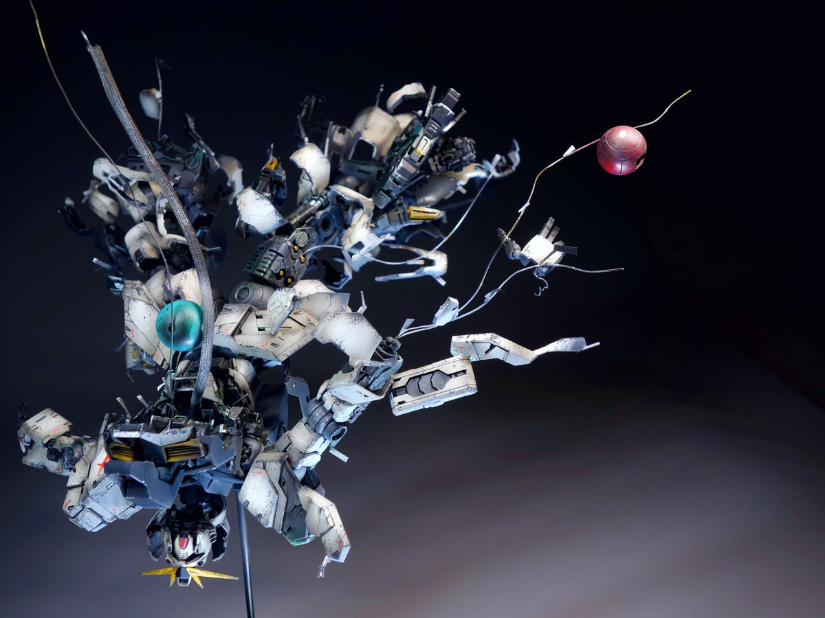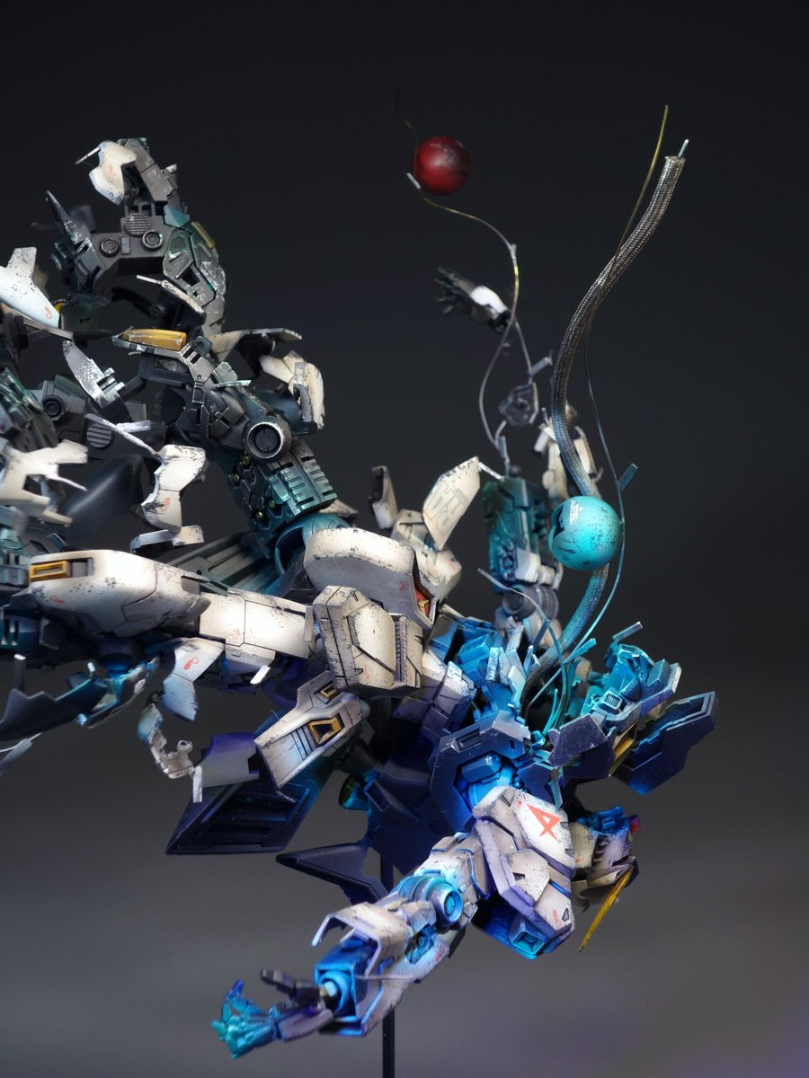 推主選用「MG 1/100 RX-93 ν鋼彈 Ver.ka.」的模型來改造,表現出當時在阻止阿克西斯落下時後,全身受損、骨架外露,徹底再現毀損的 ν 鋼彈。散落的鎧甲和夏亞攜帶的逃脫艙,用銅線連接起來,描繪出漂浮在宇宙中的模樣。