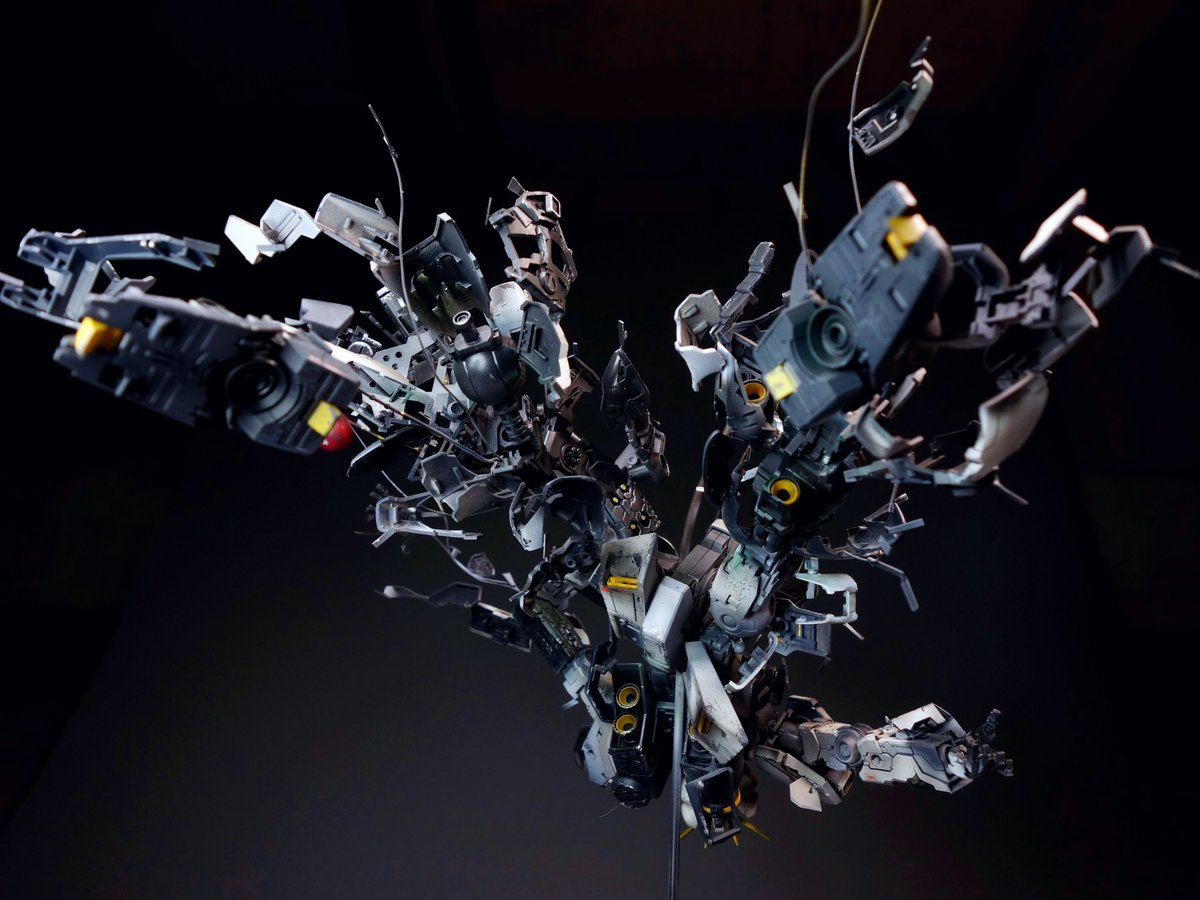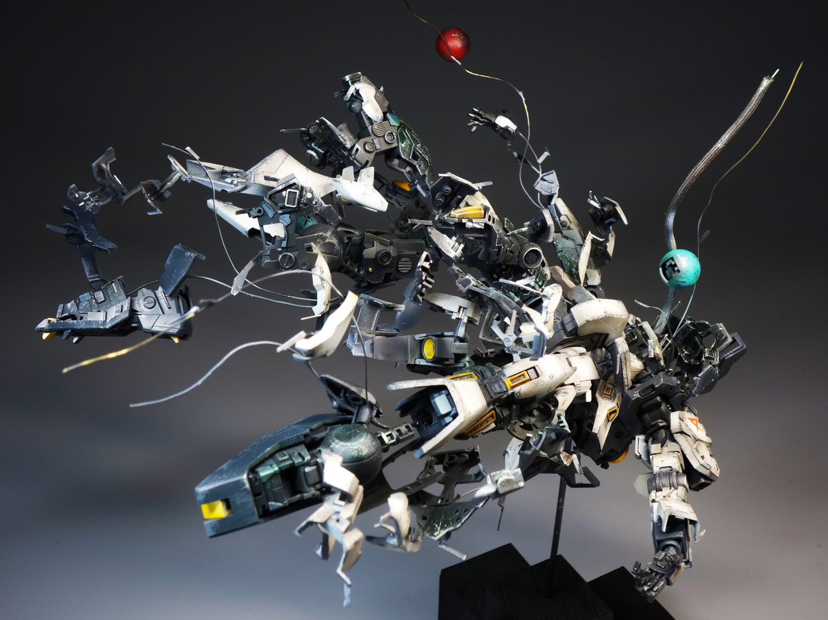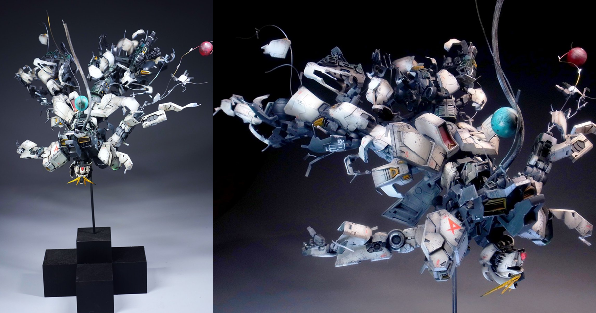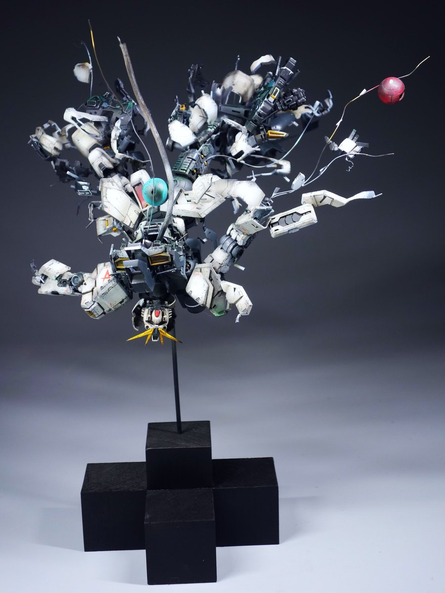推主選用「MG 1/100 RX-93 ν鋼彈 Ver.ka.」的模型來改造,表現出當時在阻止阿克西斯落下時後,全身受損、骨架外露,徹底再現毀損的 ν 鋼彈。散落的鎧甲和夏亞攜帶的逃脫艙,用銅線連接起來,描繪出漂浮在宇宙中的模樣。