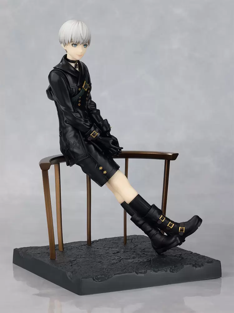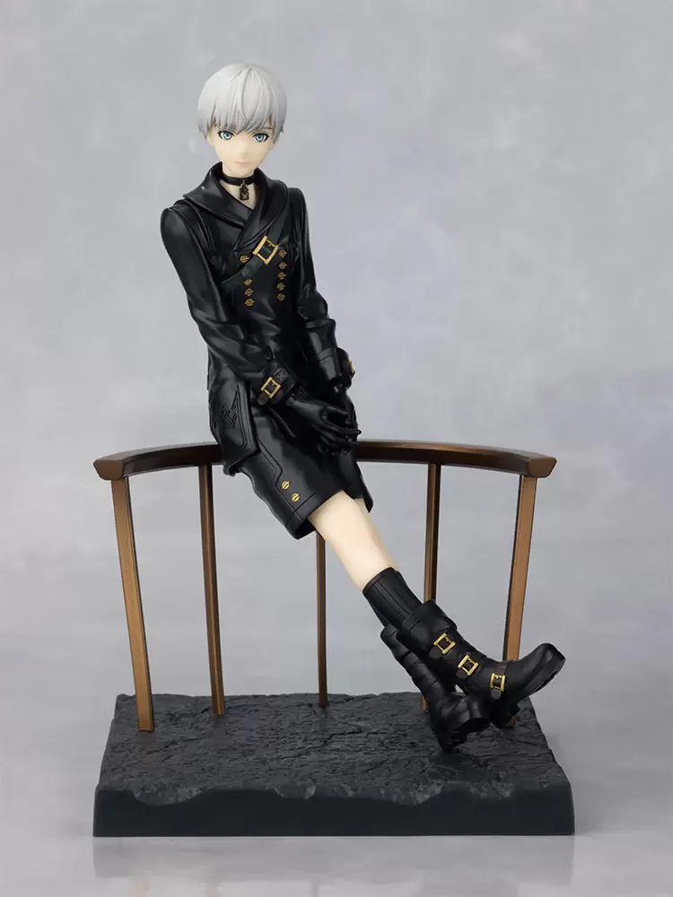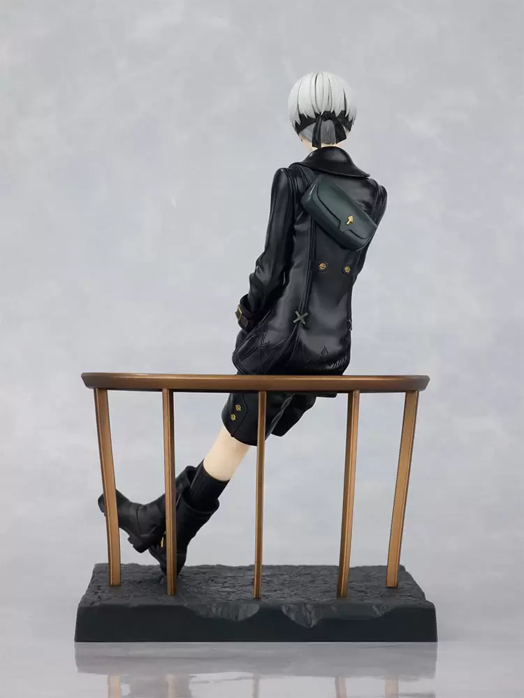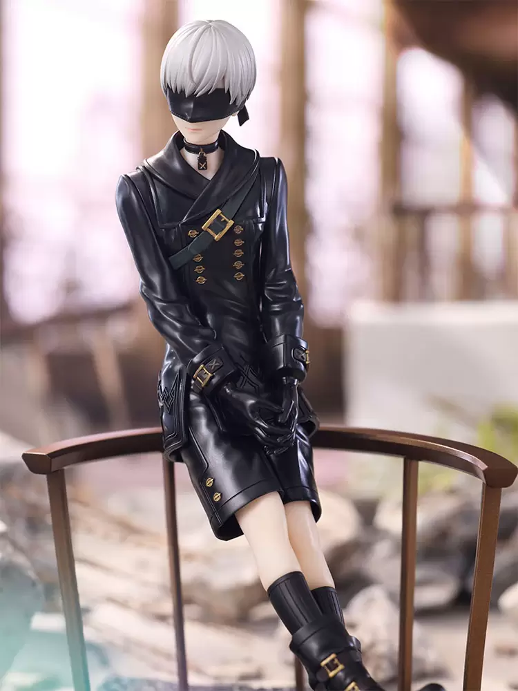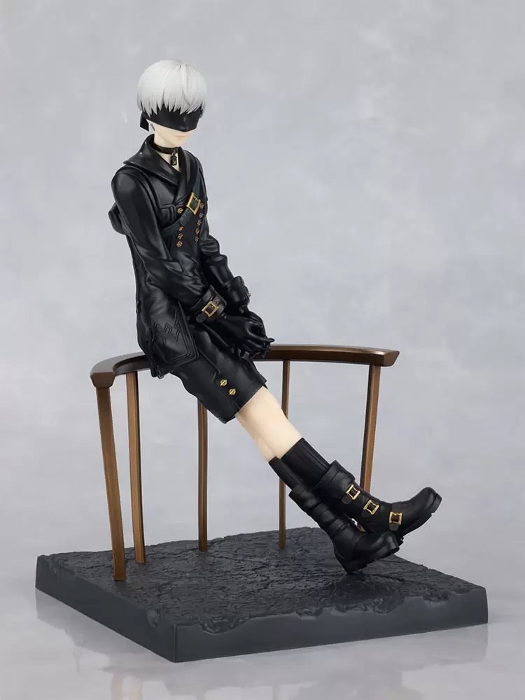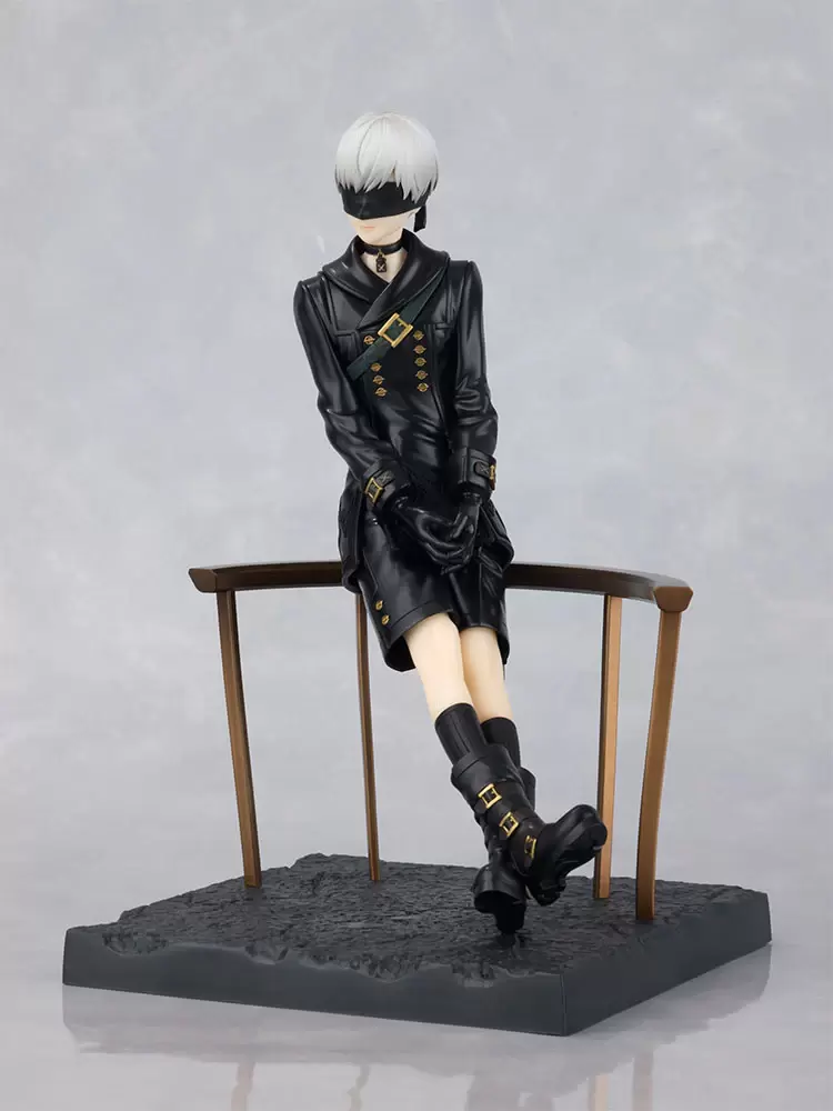 「TENITOL 9S(寄葉九號S型)」PVC模型,尺寸約高 18 公分,刻劃出 9S 靠在生鏽的柵欄上,從遠處鎖定敵人位置的模樣!一身黑色的服裝施以光澤感的塗裝,並細膩再現金色排扣、衣襬華麗的刺繡等服飾細節;淺淺一笑的表情非常可愛~另外附有未戴眼罩的替換臉部零件,可以欣賞 9S 湛藍的美麗雙眸。