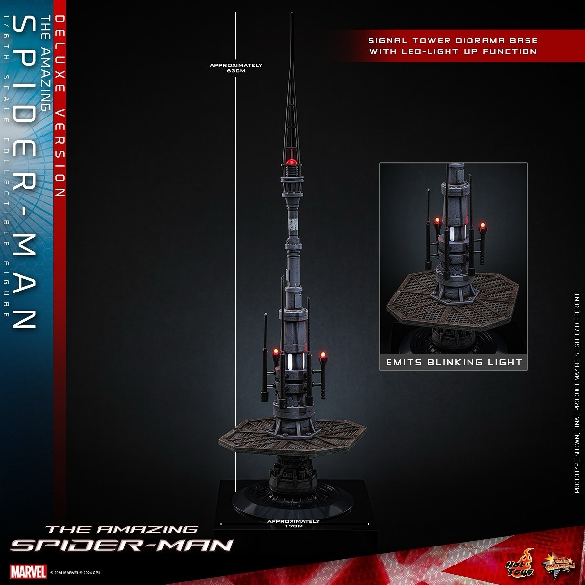 配件部分附上了此版本標誌性的狹長眼睛造型的黃色鏡片面罩頭雕及脫下的面罩、多組替換手、劇中使用的藍色背包、滑板、相機、手機及蛛絲特效,可以搭配擺設多樣的動態!豪華版更收錄高約 63 公分的場景地台,可以重現蜘蛛人在奧氏企業頂樓鐵塔戰鬥的經典場景,鐵塔頂端的紅色燈號做有 LED 發光功能,讓整體看起來更加寫實迷人!