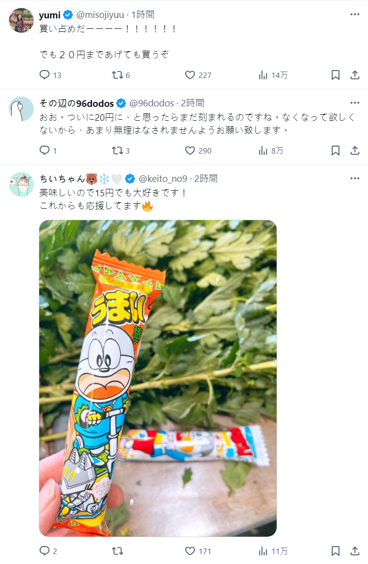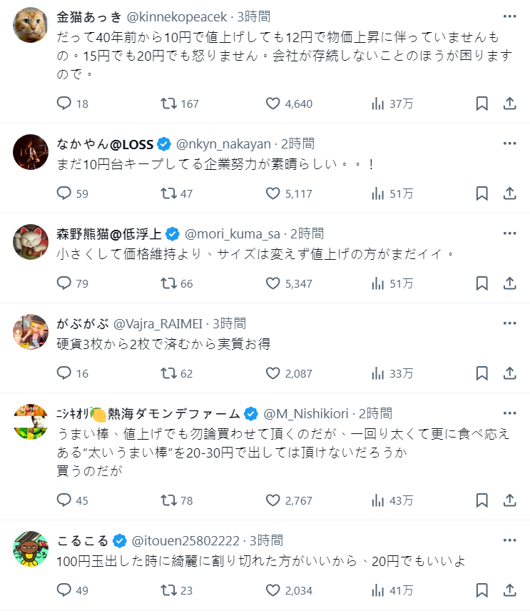 不少網友在官方 X 底下留言打氣「價格完全沒問題,一直以來謝謝你們」、「從小吃到大都是最經濟實惠的點心」、「美味棒是一種回憶,這種漲幅沒問題的」;也有網友認為「漲多一點沒關係,但是尺寸不要變小」、「就算漲到 20 日圓也可以,真的從以前到現在都很好吃」