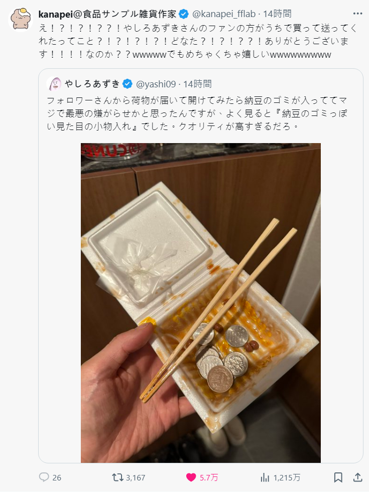 近日日本 X 上有位網路漫畫家やしろあずき ( @yashi09 ),他收到一個粉絲送的禮物,沒想到一開來看居然是個「吃過的納豆盒」,這一打開讓他心情有點悶怎麼會送這種垃圾來,不過突然發現事有蹊蹺,也引起大量網友關注,到底是發生什麼事情呢?