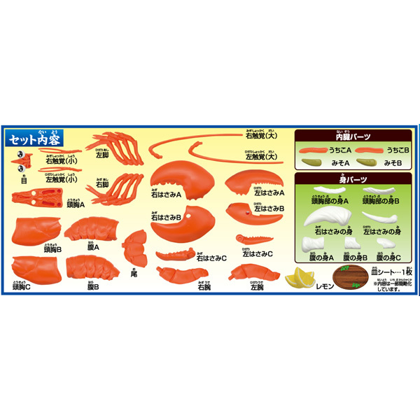 「買一整尾!!螯龍蝦解體拼圖」使用 32 塊零件構成全長約 14.5 公分的螯龍蝦本體,從蝦殼、觸角、蝦螯、各部蝦肉到蝦黃(卵巢)、蝦膏(肝胰腺)都使用單獨零件製作,並且還原真實螯龍蝦的身體構造。