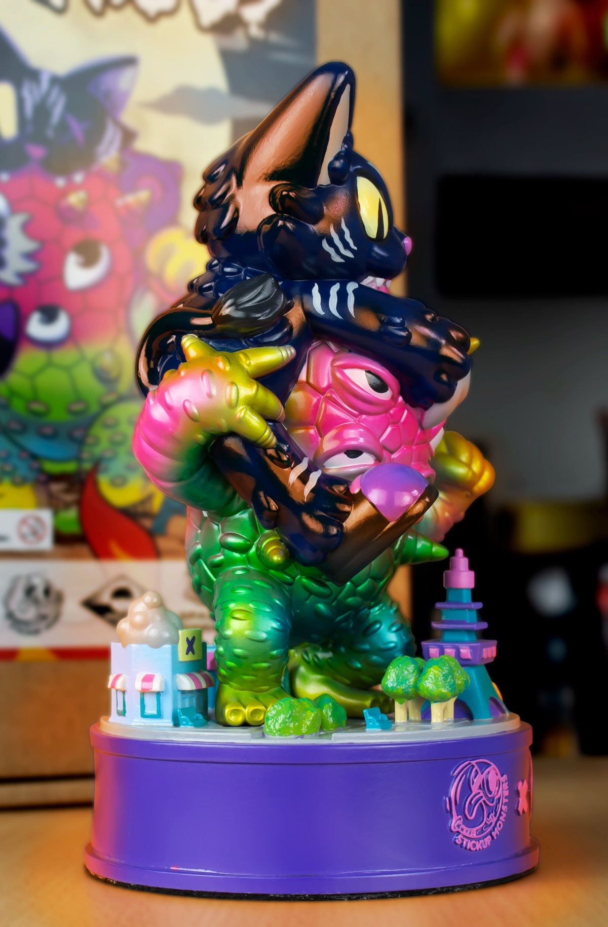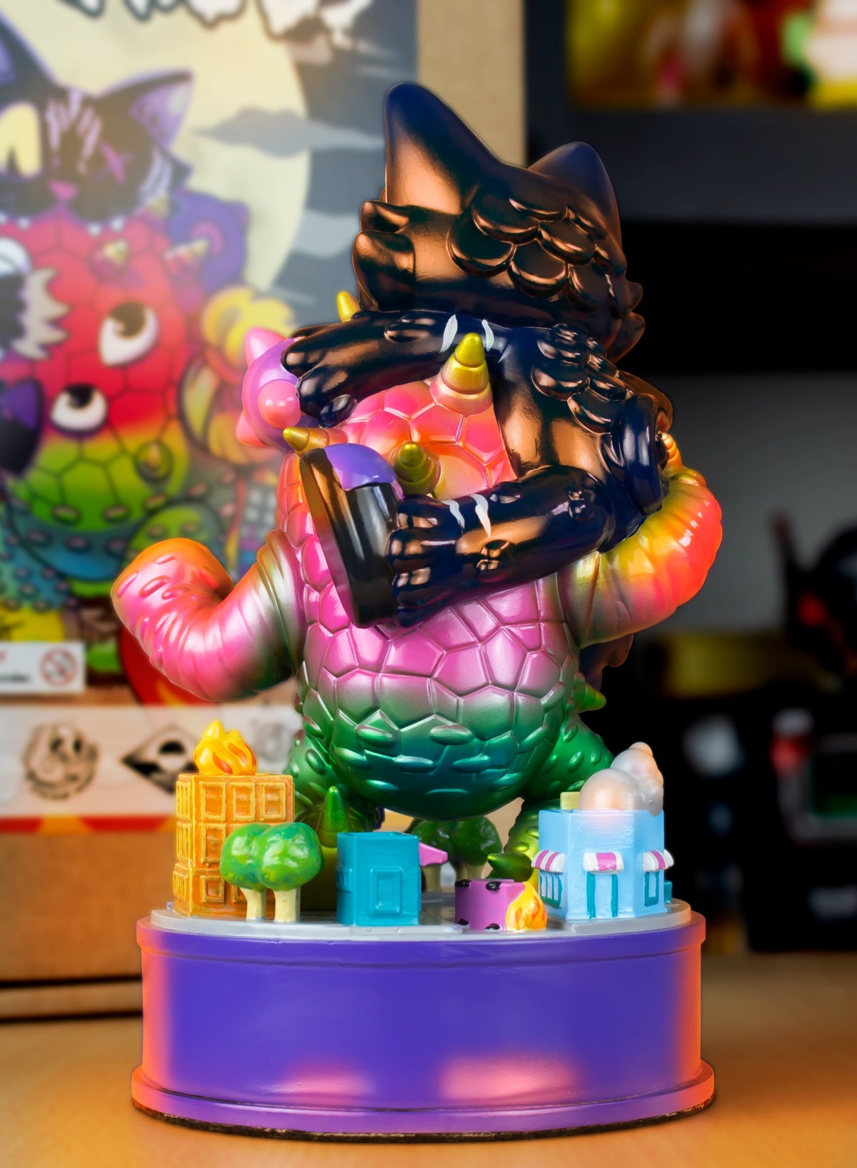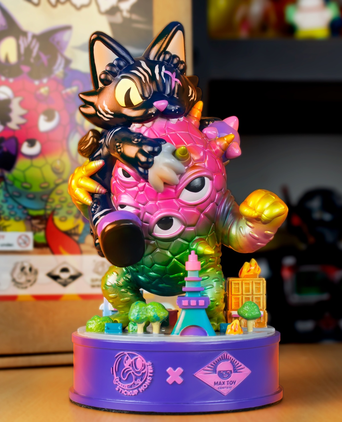 這次的「怪獸大戰」是 Javier Jiménez 和 Max Toy 創辦人 Mark Nagata 友誼的象徵,將他們各自最具人氣的角色——貓妖 Wananeko 和怪獸 Eyezon 帶入一場激烈的對決場景。巨大化的貓妖與突變怪獸,在日本的城市街頭進行狂暴戰鬥,彼此沉浸於戰鬥的樂趣中,不知不覺中將都市徹底摧毀!這一場面充滿戲劇性和視覺張力,完美展現了兩位藝術家心中的怪獸宇宙。