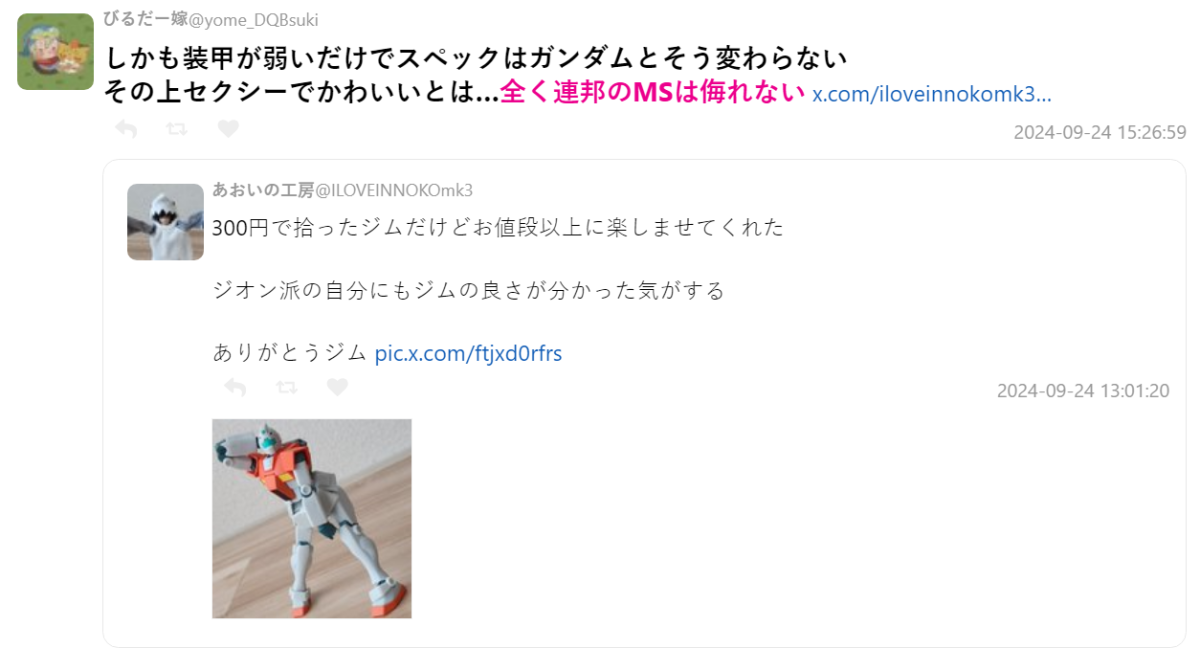 最近日本 X 上,有位鋼普拉玩家推主あおいの工房 ( @ILOVEINNOKOmk3 ) 分享了自己擺拍聯邦最標誌性的 MS「吉姆」的照片,但卻是結合「女子氣息」的主題,展現出特別的機娘風韻。這奇妙的創意也成為網友關注對象,讓他的分享成為話題。