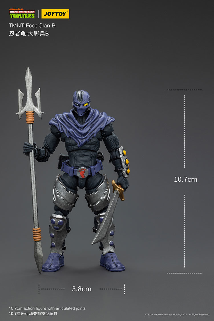 腳族忍者士兵由許瑞德和他的副手卡拉(Karai)所領軍,是數量龐大的機器人忍者軍隊,這次 JOYTOY 分別推出 A、B 兩種款式。其中 A 款製作出完好無損的腳族忍者士兵帥氣的外觀,可以從頭部側面看間些許的機械構造,手臂與腿部皆設計有護甲保護,展現戰鬥力滿滿的姿態!配件附有多組替換手、手裡劍、顯示器、小刀、三種不同造型的步槍、手槍以及搋子,可以搭配擺設出各種帥氣、搞笑的模樣!