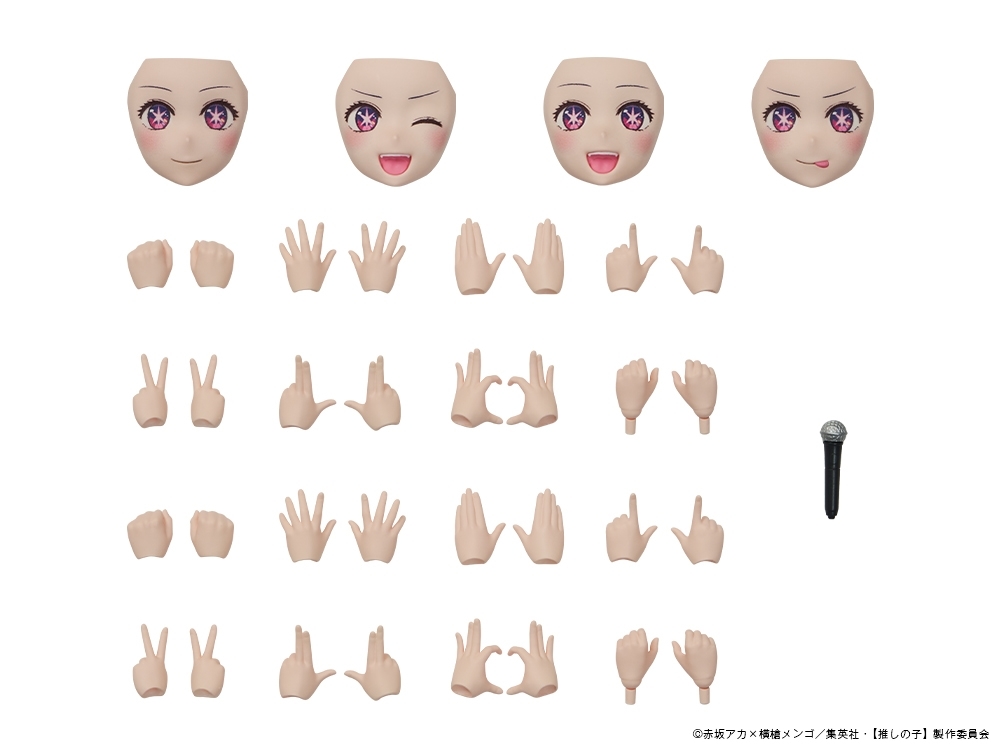 本次的 KADOPLA 星野愛組裝完成後高約 15.6 公分,DX 版本同時收錄華麗的演出服和清涼的原創泳裝兩種身體,透過成型分色與預塗裝零件還原出 B 小町絕對王牌兩種造型下的亮麗身形!配件附有偶像不可或缺的麥克風以及「笑臉」、「眨眼臉」、「開口笑臉」、「吐舌臉」四種表情零件,並收錄了包含標誌性的愛心手及剪刀手等、演出服及泳裝兩種造型各八款的替換手配件,提供多樣的擺設選擇!