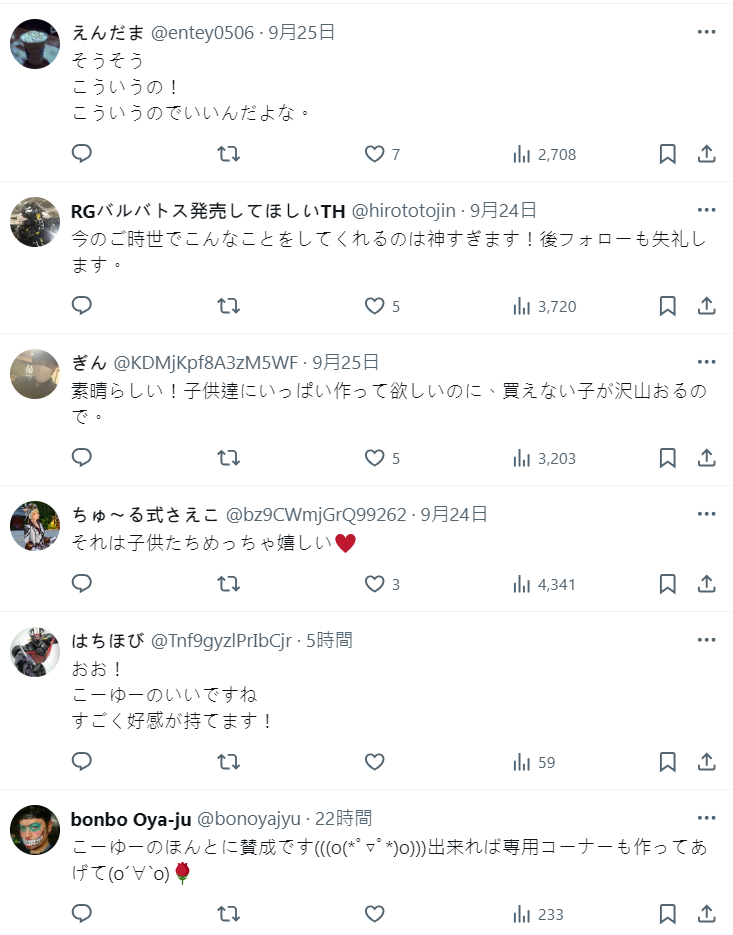 不過亦有網友指出,看過大人透過小孩作為管道來讓他們購買模型。曾看過帶著孩子逛鋼彈基地的大人們,雖說買了許多模型,卻從孩子的臉上他們並不開心,畢竟掃貨團還是有對策,這點還是讓人憂心。