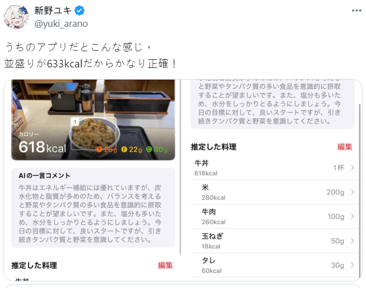 在日本有個健康的手機應用程式「あすけん」,這是個能替你計算飲食的卡路里,並透過程式內的功能替你有效的節制飲食,在日本也是非常人氣的 app。不過近日在 X 上,有推主貼出其功能之一的「食物照片計算卡路里」,竟然測出「一碗牛丼」居然僅 190 大卡,這樣的奇景立刻引起網民關注。