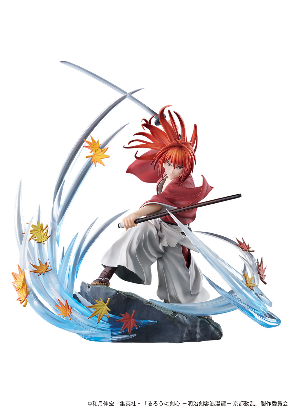 本次的緋村劍心 雙龍閃 Ver. 高約 26.5 公分,造型出自即將在 10月開播的「京都動亂篇」,由漫畫原作和月伸宏老師完全監修,製作出劍心戰鬥中一手持逆刃刀、一手持刀鞘,使出「飛天御劍流·拔刀術·雙龍閃」的姿態!飄逸的服裝及紅色長髮與藍色彩透特效件的交織,搭配斜面的碎石地台營造出強大的視覺張力,周邊揚起落葉的點綴更讓整體呈現出剛中帶柔的禪意!