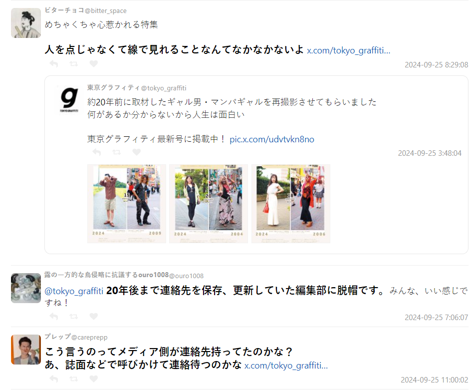 近日日本流行雜誌《Tokyo graffiti》,在 X 上公布了一則企劃照片,由「10多年後街頭穿搭的同位民眾」來表達民眾成長跟衣著的品味改變,找出的案例讓人嘖嘖稱奇,瞬間成為網路話題。