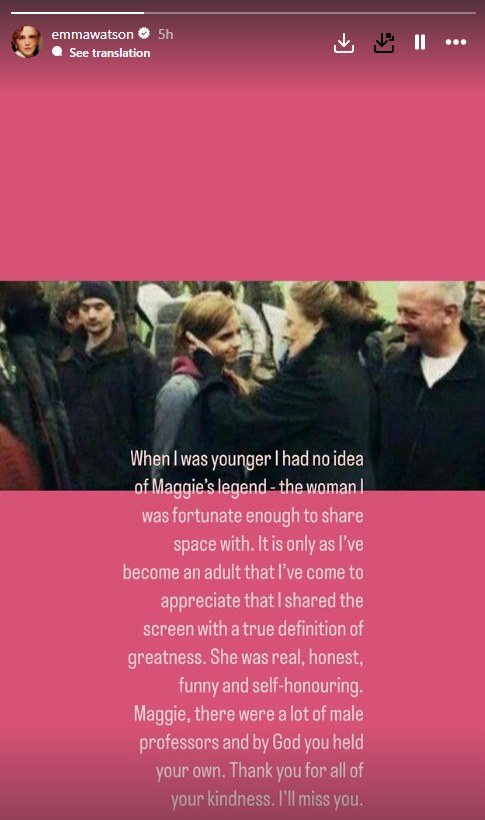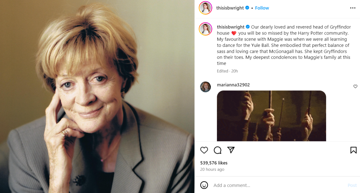 「金妮衛斯理」邦妮·懷特(Bonnie Wright)也在 IG 寫道:「你將會被《哈利波特》世界的朋友們永遠懷念。我最喜歡與瑪姬合作的一個場景,是我們為聖誕舞會學習跳舞時。她完美體現了麥教授那種充滿活力同時又慈祥的特質,她讓葛蘭芬多的學生們時刻保持警惕。我對瑪姬的家人表示最深切的哀悼。」