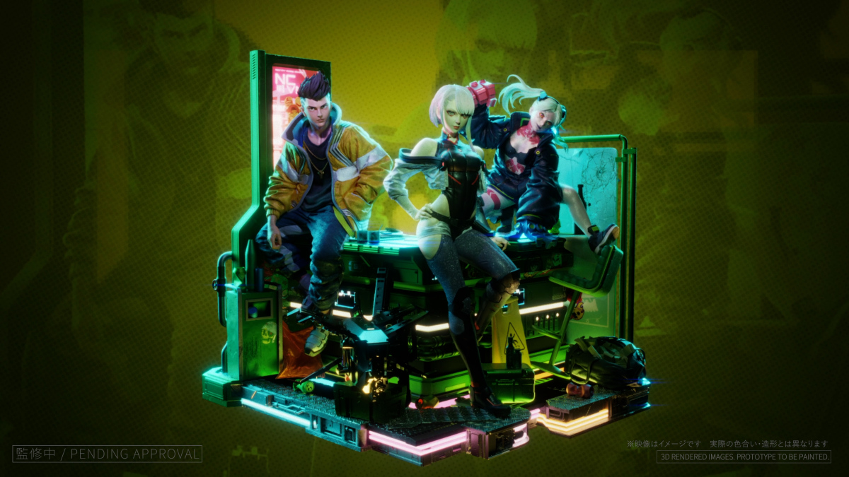 從目前公開的 3D 渲染圖像可以看到這次是製作了男女主角大衛、露西以及大家的老婆蕾貝卡三人依靠在桌邊的模樣,將原作遊戲的寫實風格結合邊緣行者動畫的造型,呈現出遊走於遊戲與動畫間的帥氣視覺效果!由於三個角色的品項名稱是分開的,所以有可能會是採角色拆賣、可以將三件作品結合的形式販售,詳細的商品圖片及販售資訊將於日後公開,相當的讓人期待啊!