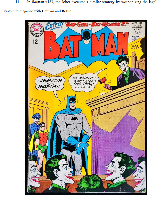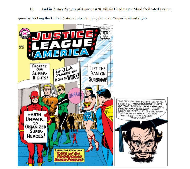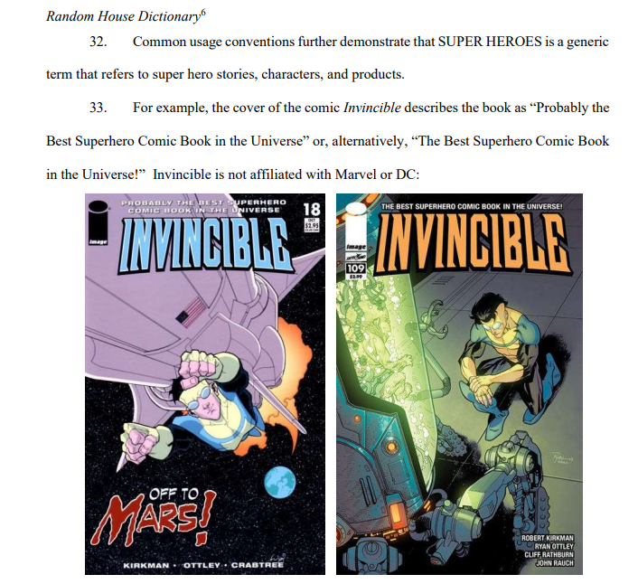 值得一提的是,這份法律文件是由一位漫畫迷所寫,他引用了Ryan North的《 Fantastic Four》、Brian Bendis與 Mark Bagley的《Ultimate Spider-Man》,以及白銀時期的《Batman》、《Justice League Of America》,甚至也以Image Comics的《無敵少俠》(Invincible)來佐證「超級英雄」是通用詞彙的證明。