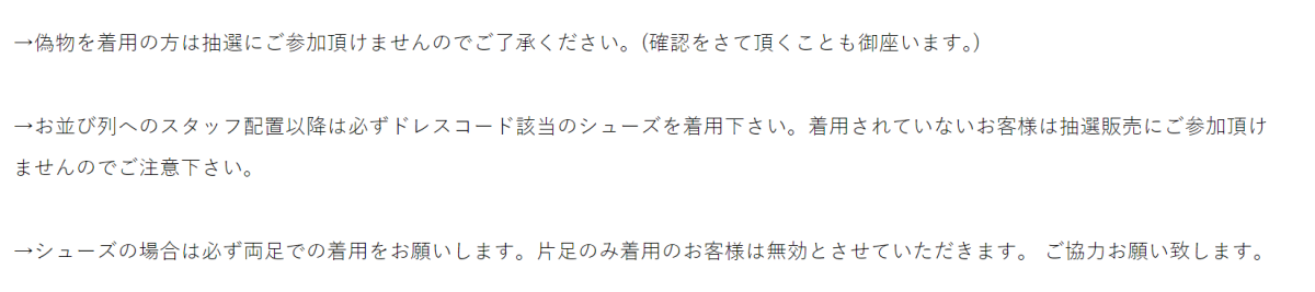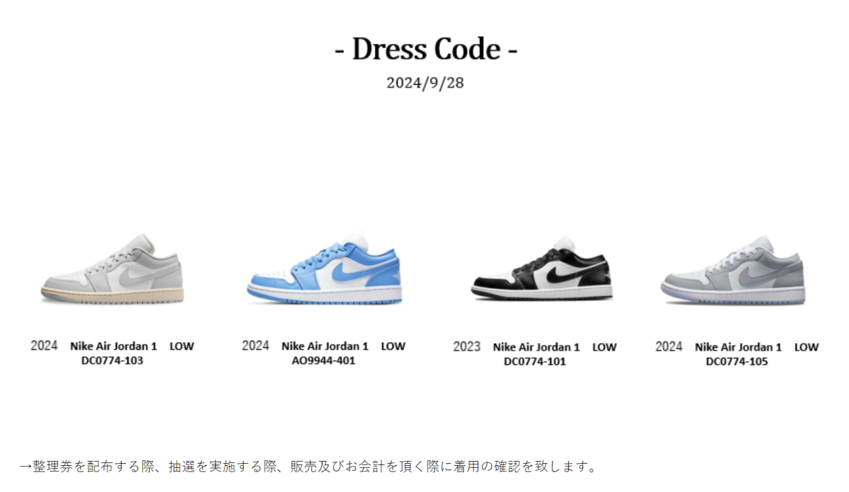 結果不出所料,在 atmos pink flagship 原宿店的官網上,有附上當日抽選的 Dress Code,必須穿著以下四款鞋子才能參加抽選,這樣的條件也的確讓人感到趣味,原來有這樣的方法來限制消費條件。
