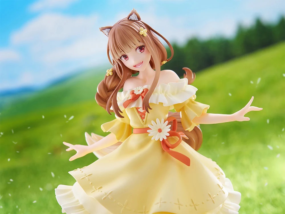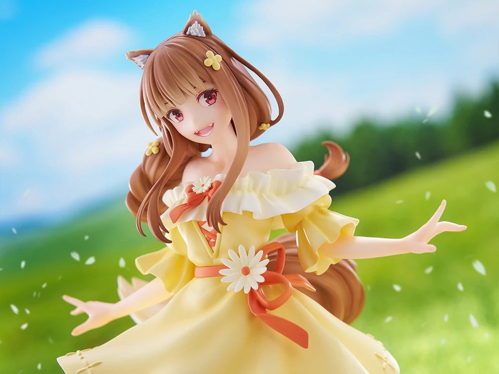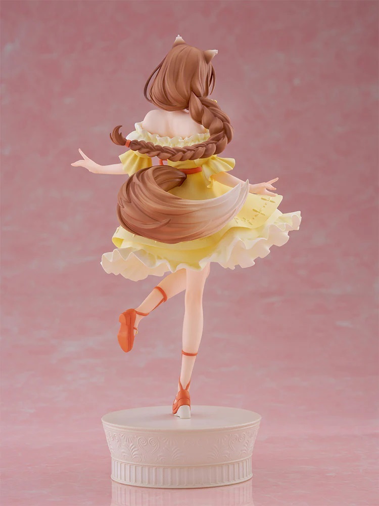 這款TENITOL的赫蘿,全高約23公分,赫蘿穿著一身黃色的洋裝,搭配她的表情與躍動的姿勢,整體氣氛更顯得可愛,身上的裝飾,以及赫蘿的髮型與尾巴等等,都相當細緻。