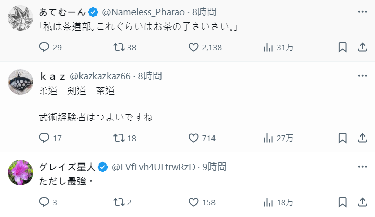 網友不僅讚賞她的英勇的行為,也開玩笑說原來茶道部可以這麼強悍,是不是柔道劍道武術什麼的都學了來對付惡人 XD。