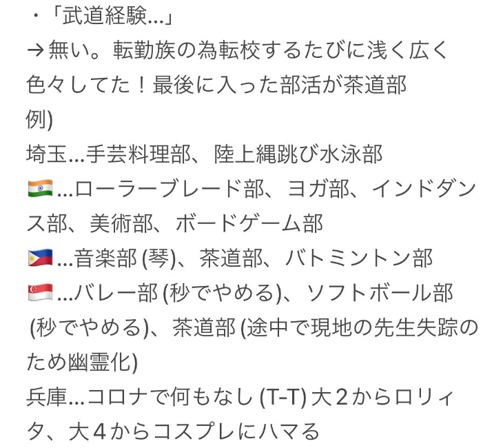 有不少網友好奇她是不是有武術經驗,她也表明完全沒有,因為自己念書時曾轉學甚至出國,其實基本上參加的都跟武術一點關係都沒有,最後加入自己喜歡的社團就是茶道部。