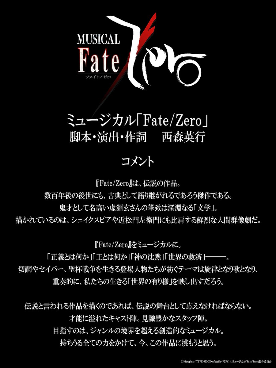 其中由名作家虛淵玄創作的小說《Fate/Zero》,不僅故事獨特,改編的電視動畫衍生作品也頗具代表性。今日 ( 10/1 ) 官方正式宣布,將製作《Fate/Zero》的真人音樂劇,預定將於 2025 年 1 月到 2 月間開演。