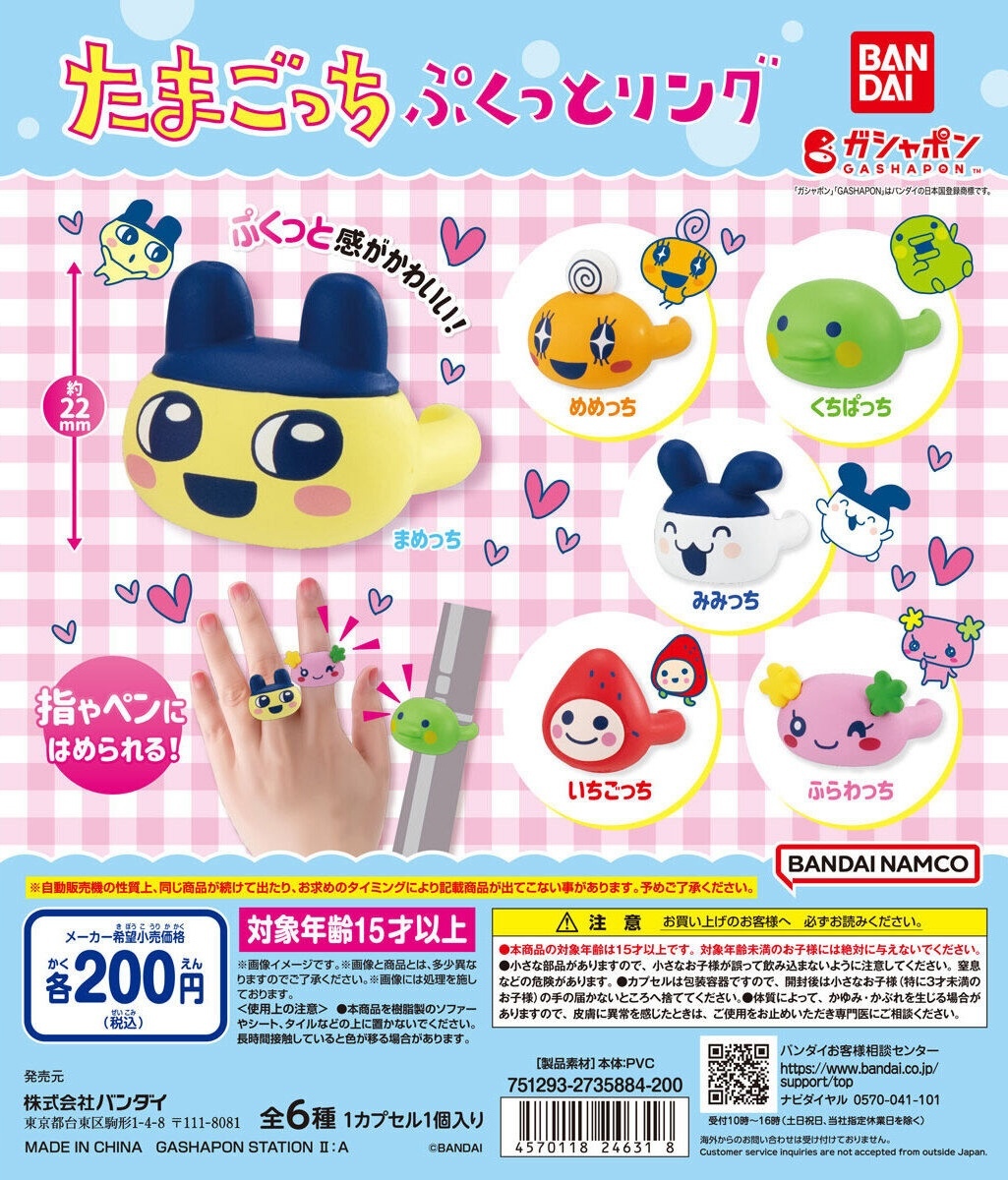 日本萬代公司轉蛋事業部 GASHAPON 推出掌上型電子寵物遊戲機「塔麻可吉」主題的新商品——「塔麻可吉 膨膨戒指」(暫譯:たまごっち ぷくっとリング)轉蛋,參考售價為每轉 200 日圓,預計於 2024 年 10 月第一週發售!