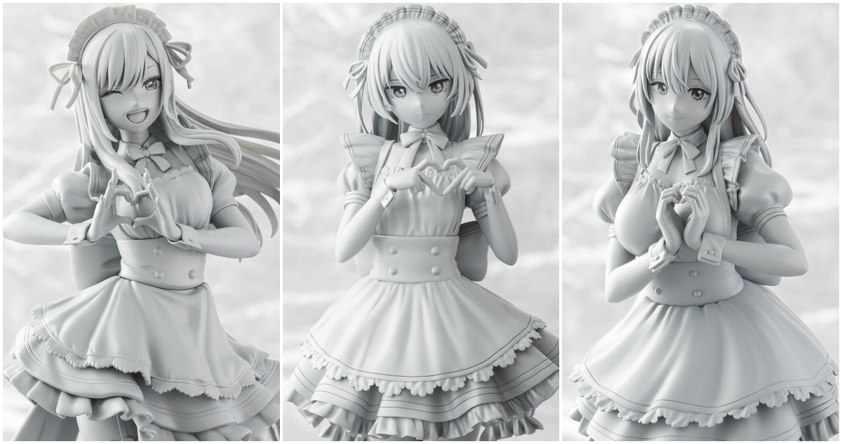 搶先公開的 S-FIRE「喜多川海夢」、「乾紗壽葉」、「乾心壽」的未上色原型,三人以可愛的女僕裝造型登場!精緻地刻劃出女僕裝層次豐富的荷葉邊澎裙、髮帶等服裝細節;能夠展現角色性格的用手比出愛心的姿勢也超級可愛~散發出偶像般的魅力★